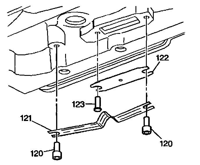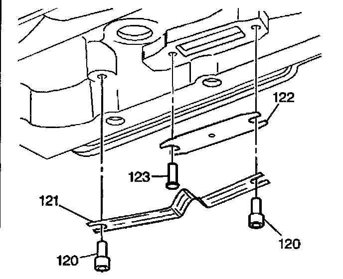6. Carefully install the thermo element (121) between the two pin and washers (120). The V in the thermo element (121) must contact the thermo element plate (122).