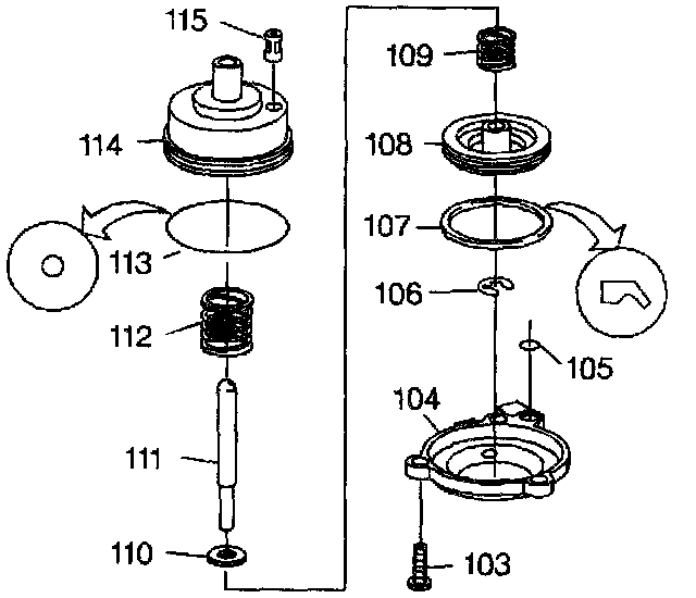 3. Remove the piston assembly (108), the servo piston spring (112), and the servo exhaust screen (115) from the cylinder (114).