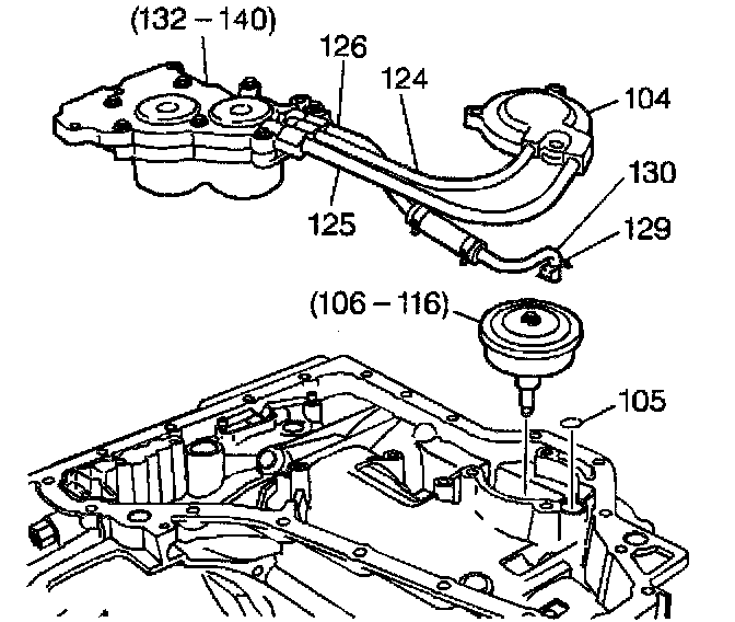 5. Remove both the 1-2 and 2-3 accumulator assembly (132-140) and the manual 2-1 band servo assembly (106-116) out of the case at the same time.
