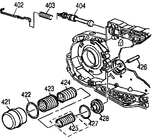 4. Install the springs (423, 424, 425) into the 3-4 accumulator cylinder (421).