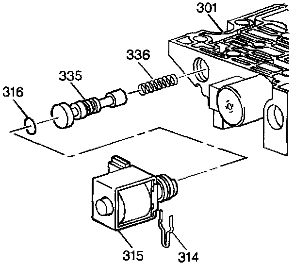 1. Remove the spring clip retainer (314) from the Torque Converter Clutch (TCC) solenoid.