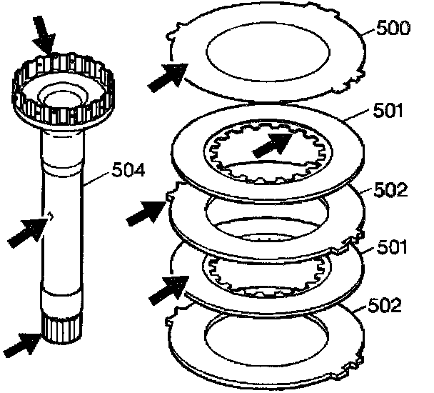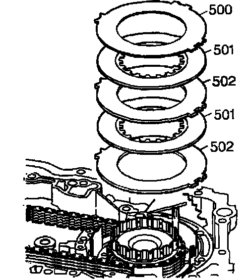 6. Insert the remaining fourth clutch plates, alternating between fiber plates (501) and steel plates (502).