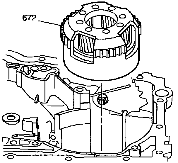 8. Insert the input carrier assembly (672) into the case and rotate the carrier so that the pinions engage the reaction carrier internal gear.