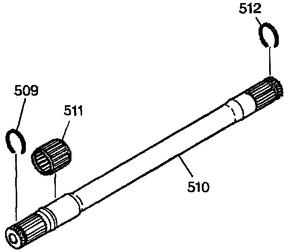 2. Affix the drive axle retainer ring (509) and the output shaft differential in board snap ring (512) onto the output shaft (510).