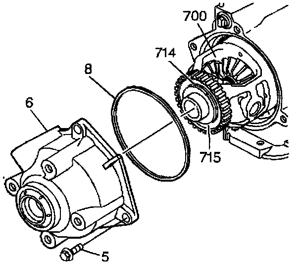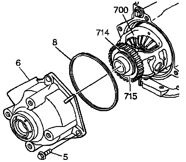 8. Affix the thrust washer (714) and the thrust bearing (715) onto the differential carrier (700).