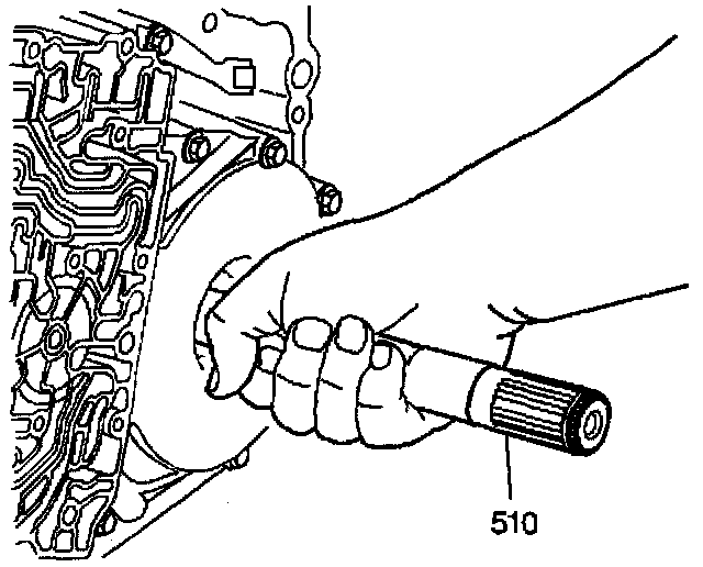 6. Hold the front differential carrier (700) in place and carefully install the output shaft (510) into the transmission. Extend the shaft through the differential side gear.