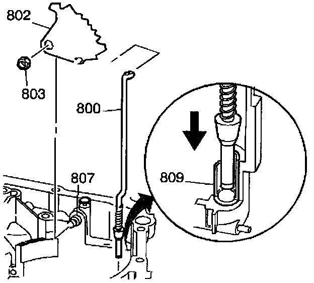 12. Assemble the manual shift shaft detent lever (802) onto the actuator assembly and onto the manual shift shaft (807).