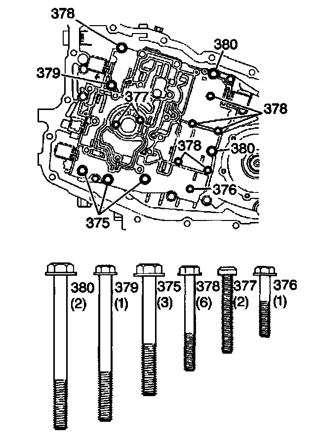 3. Remove the valve body bolts (375-380).