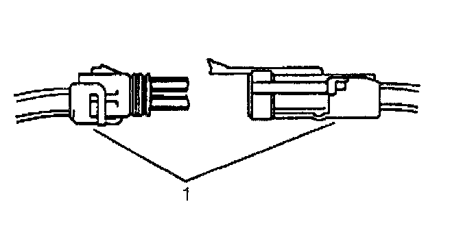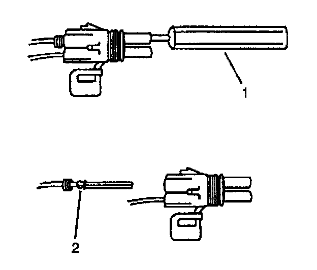 ^ Insert the Weather Pack (R) terminal removal tool into the front (mating end) of the connector cavity until it rests on the cavity shoulder (1).