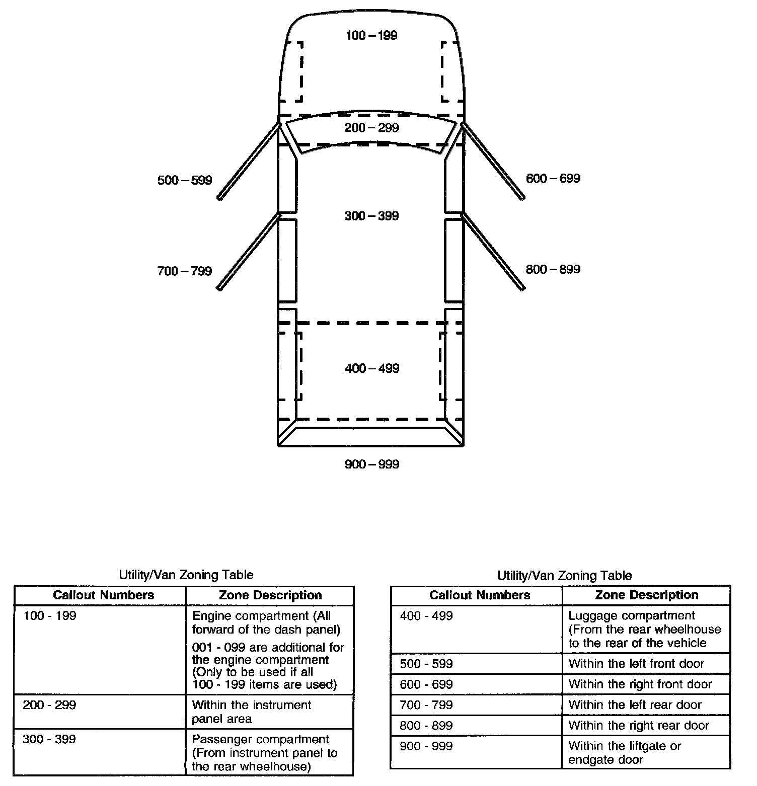 All grounds, in-line connectors, pass-through grommets, and splices have identifying numbers that corresponds to where they are located in the vehicle. The table explains the numbering system.