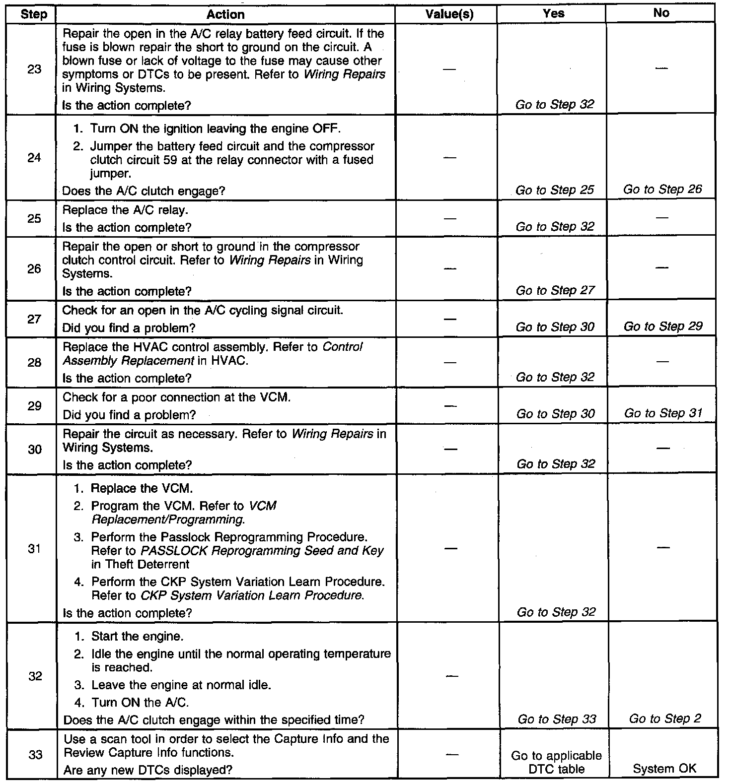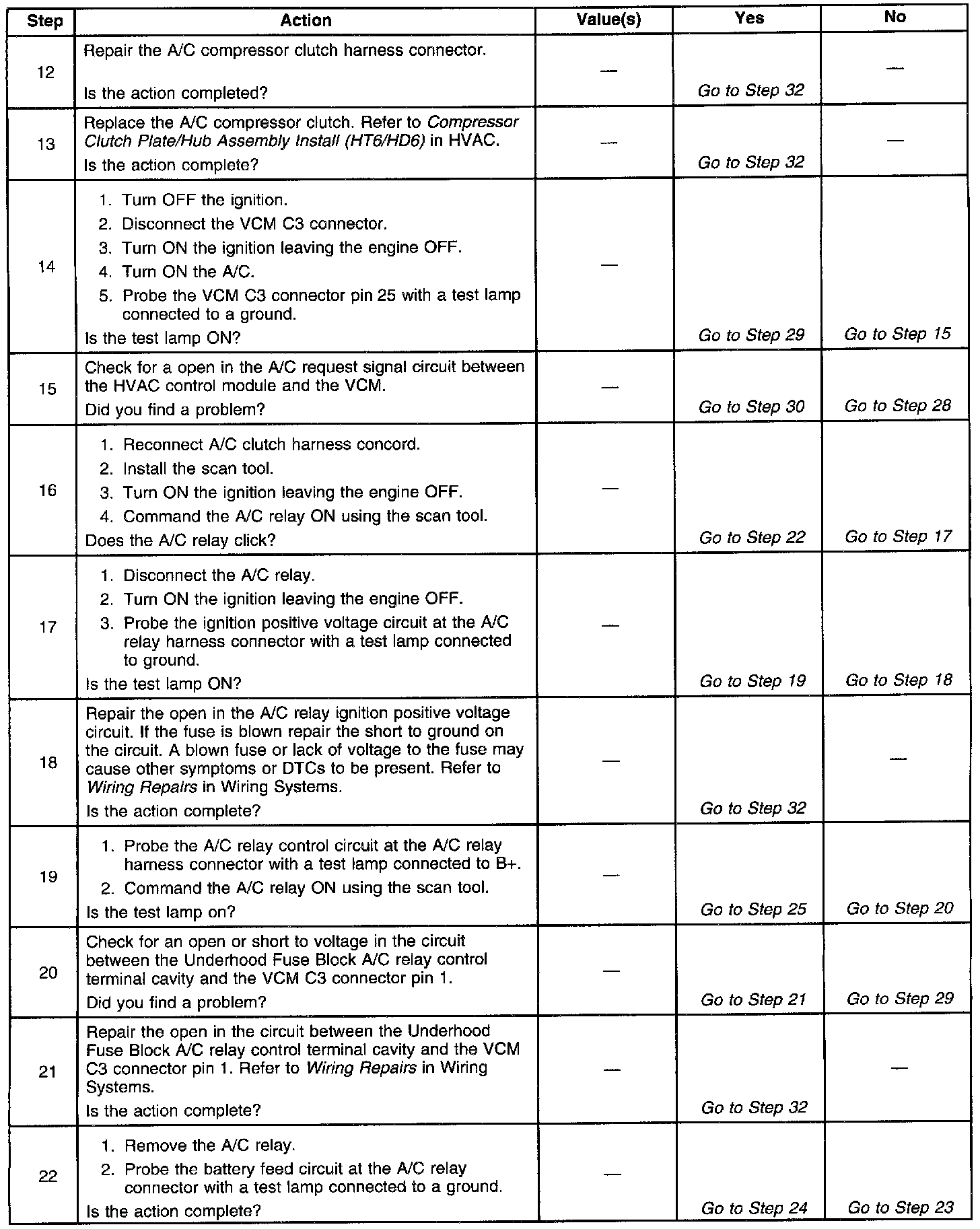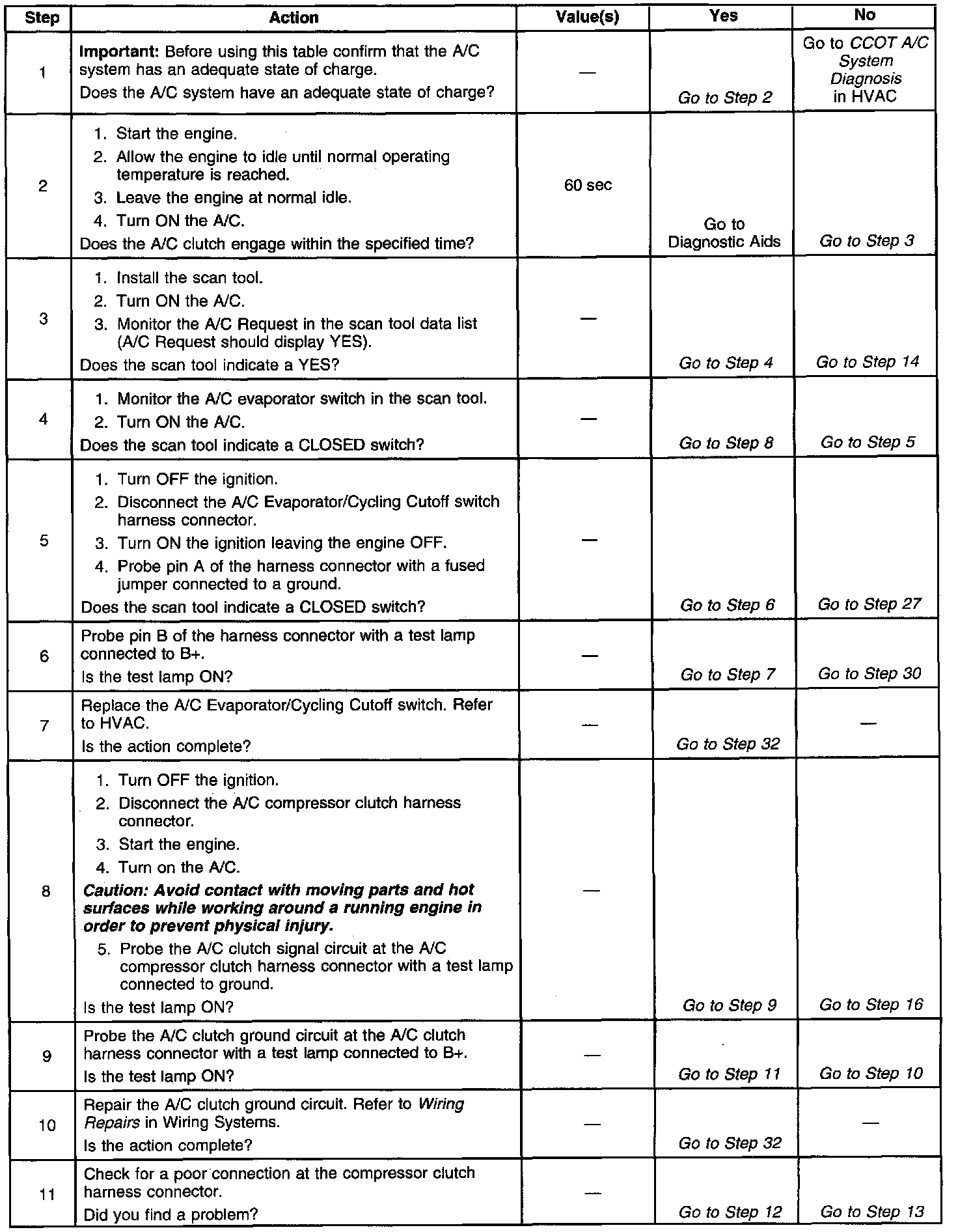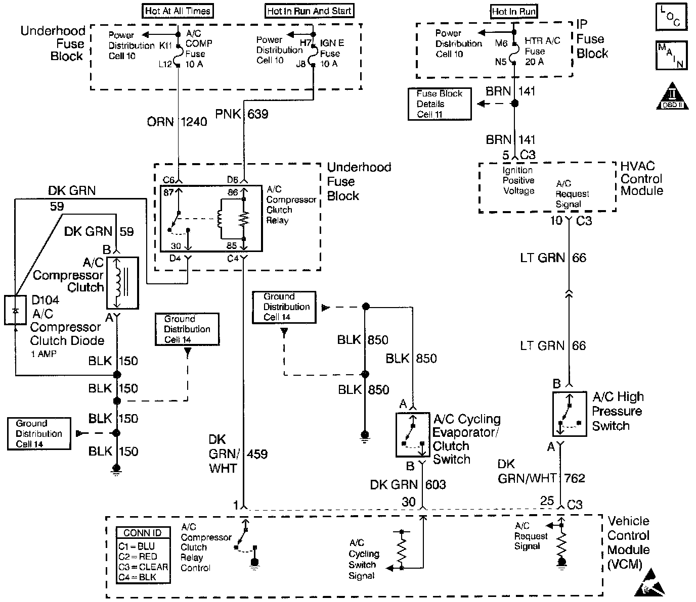 Turning the air conditioning ON supplies battery voltage through the pressure switches to the VCM. When the VCM receives the voltage on the A/C request signal, the A/C enable relay circuit is grounded. The A/C compressor clutch then engages.