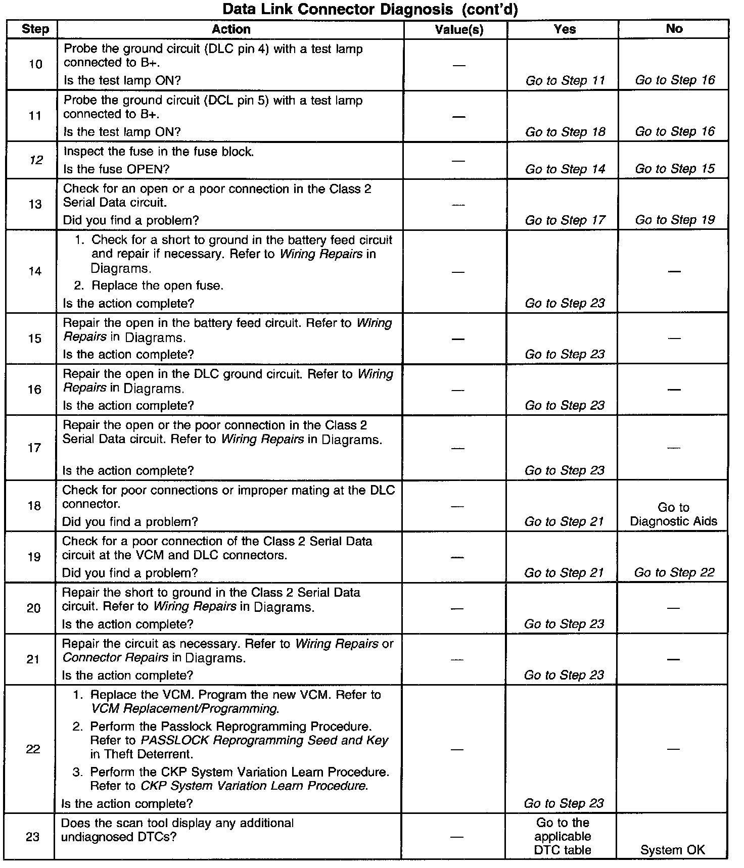 The Class 2 Serial Data circuit to the DLC allows bi-directional communication between the VCM and the scan tool. This is accomplished through pin of the DLC. If the communication between the scan tool and the VCM cannot be established, use the procedure in the DLC diagnosis table in order to diagnose the condition.