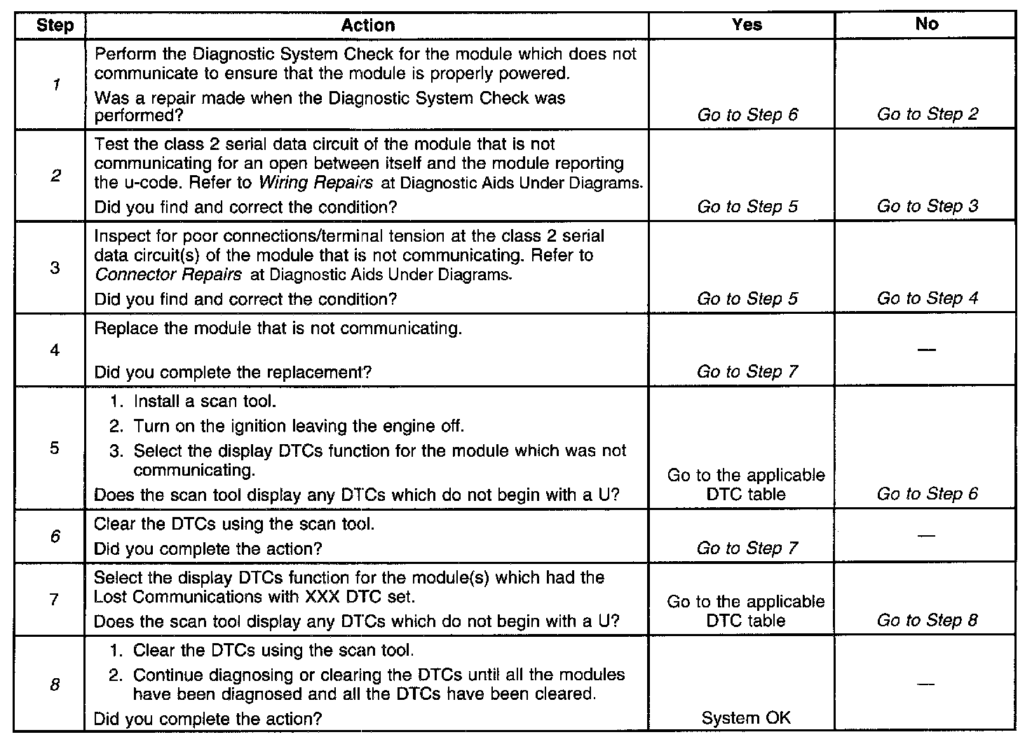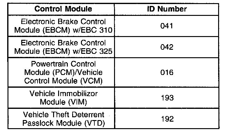 The Control Module ID Number list provides a method for determining which module is not communicating. A module with an internal class 2 serial data circuit malfunction or which loses power during the current ignition cycle would have a Lost Communication DTC set by other modules. Use the Control Module ID Number list in order to determine which module is not communicating and the Lost Communications with 1XXX diagnostic table in order to diagnose the malfunction.