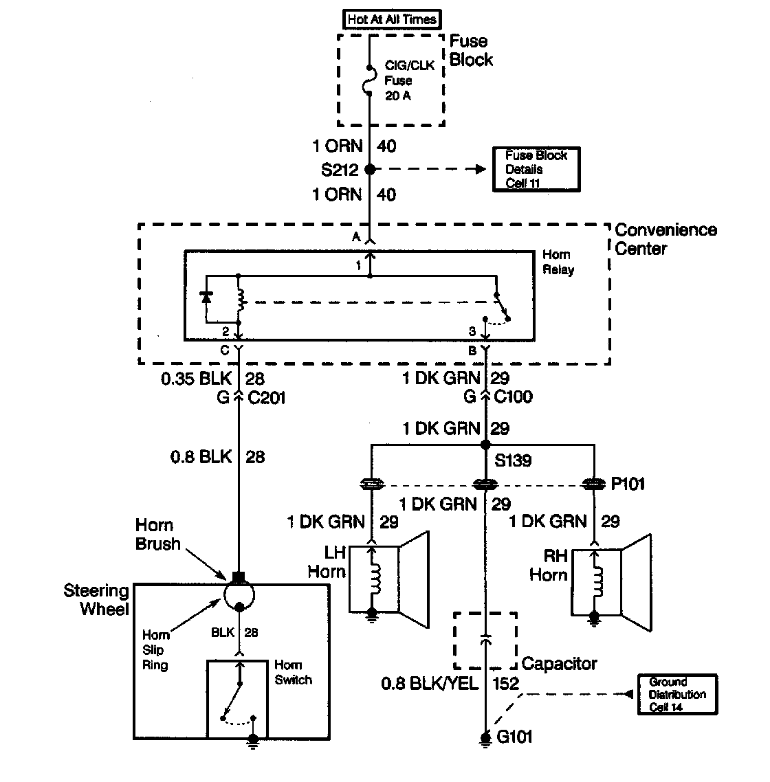 When diagnosing a horn problem use the service information located in the Horns service category. The following schematic is a typical example of a schematic with its supporting text.