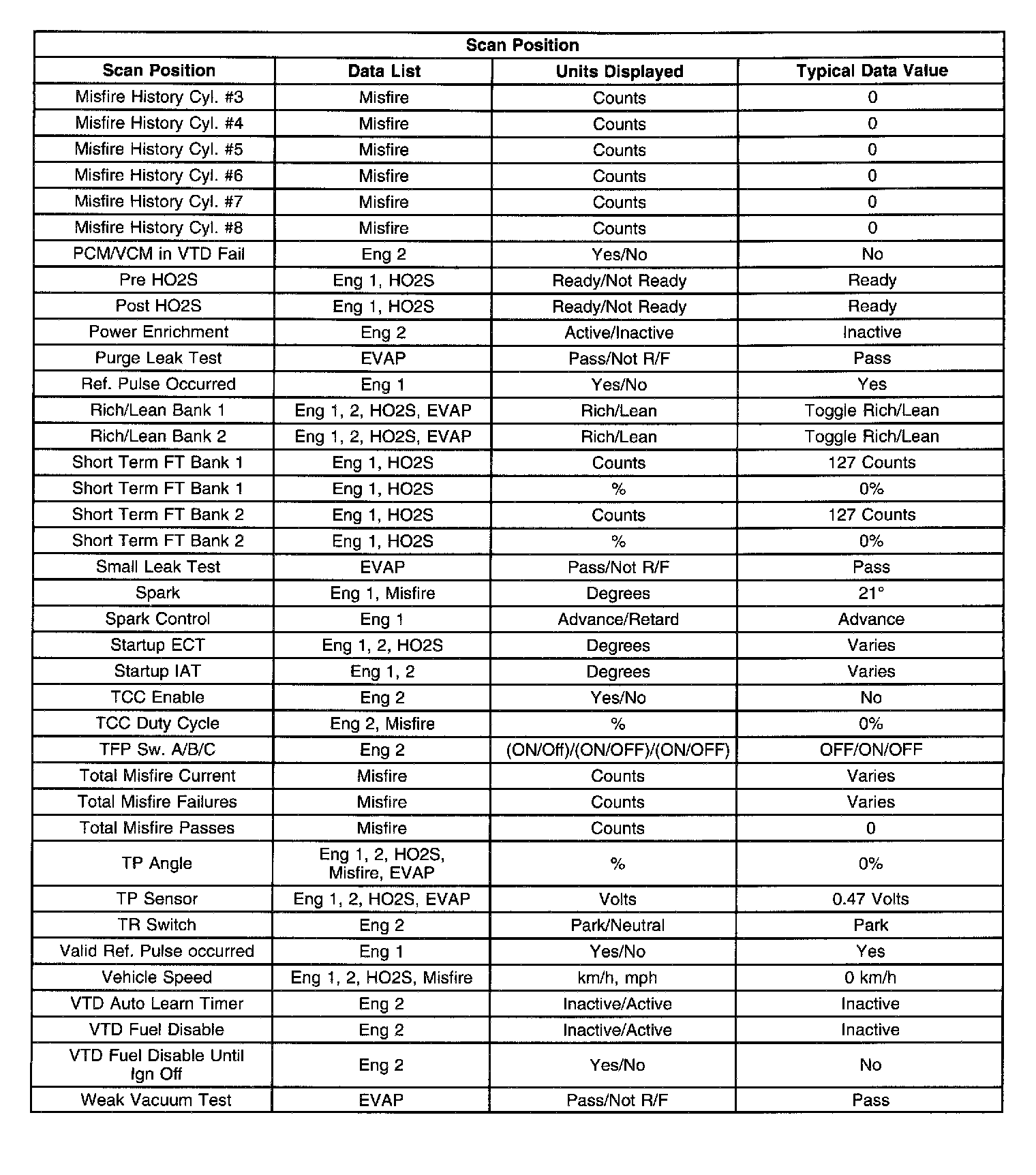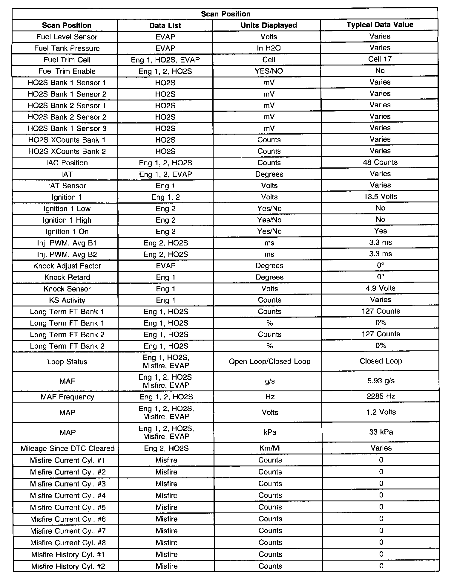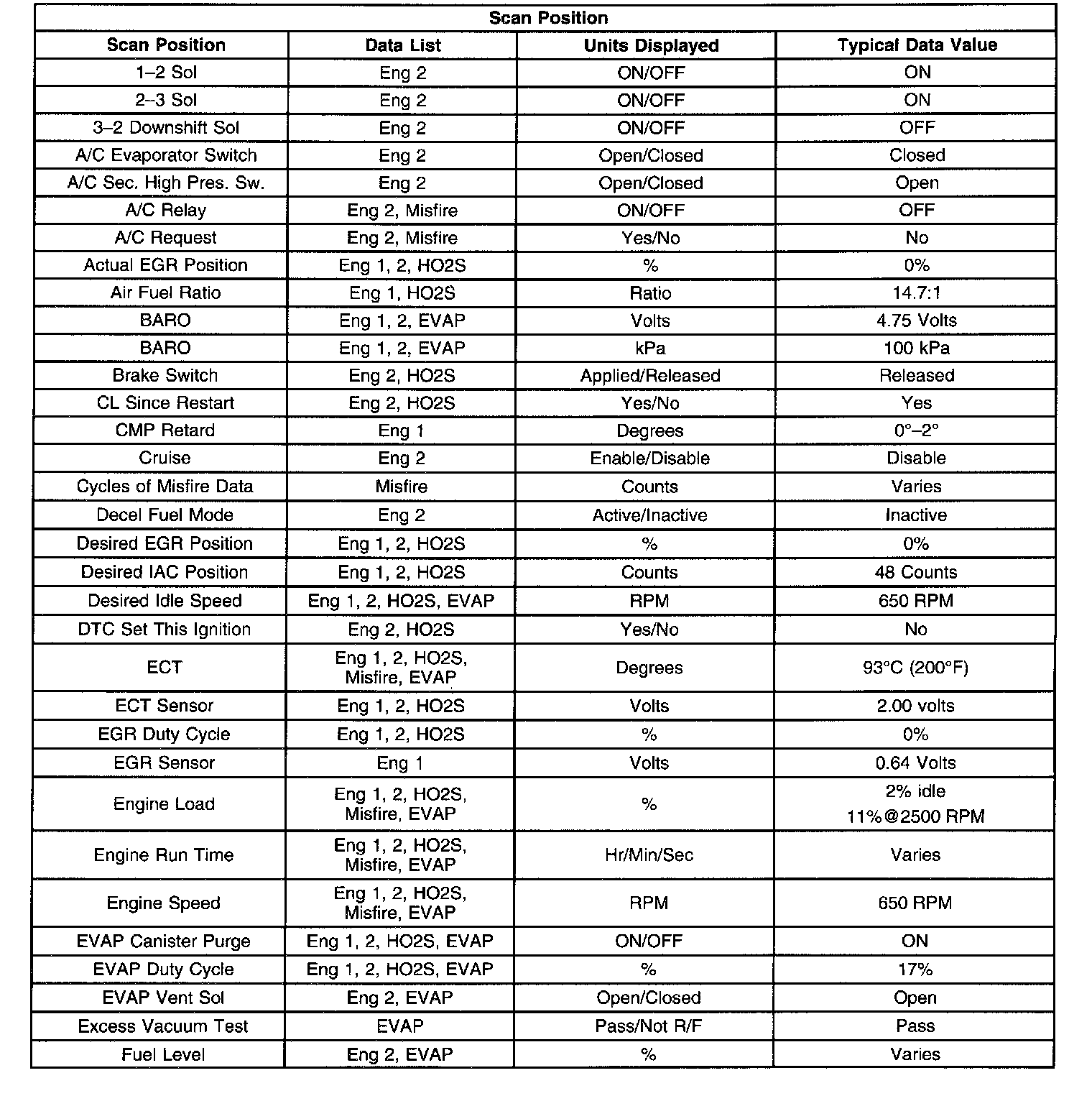 Use the scan tool data listed in this table for comparison after the On-Board Diagnostic system check and finding the on-board diagnostics function properly with no diagnostic codes displayed.