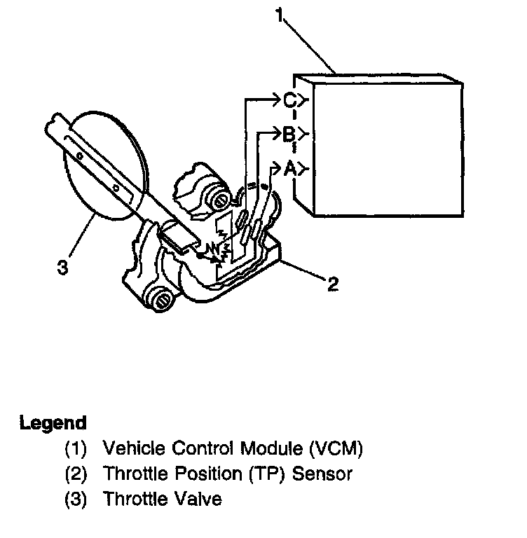 The Throttle Position (TP) sensor is a potentiometer. The TP sensor is connected to the throttle shaft on the throttle body. By monitoring the voltage on the signal line, the VCM calculates the throttle position. As the throttle valve angle is changed (the accelerator pedal is moved), the TP sensor signal also changes. At a closed throttle position, the output of the TP sensor is low. As the throttle valve opens, the output increases so that at Wide Open Throttle (WOT), the output voltage should be above 4.0 volts.