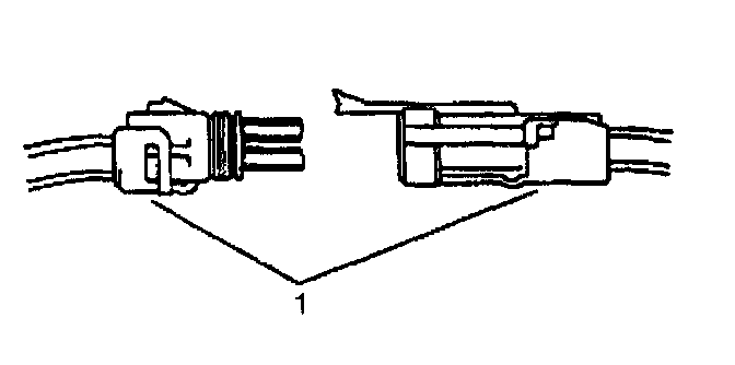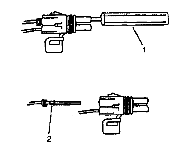 ^ Insert the Weather Pack (R) terminal removal tool into the front (mating end) of the connector cavity until it rests on the cavity shoulder (1).