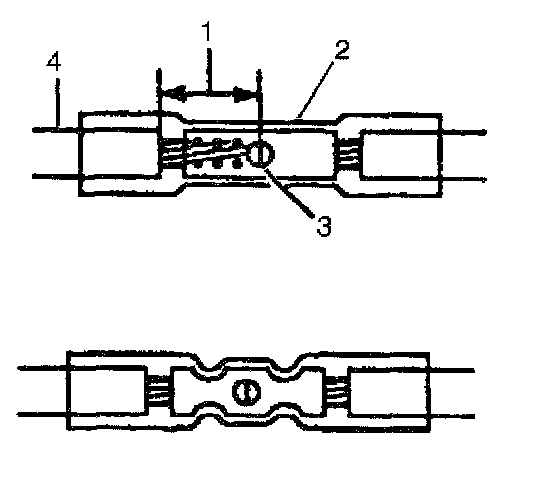 9. Insert the wires into the splice sleeve until the wire hits the barrel stop. The splice sleeve has a stop in the middle of the barrel in order to prevent the wire from passing through the splice (3).
