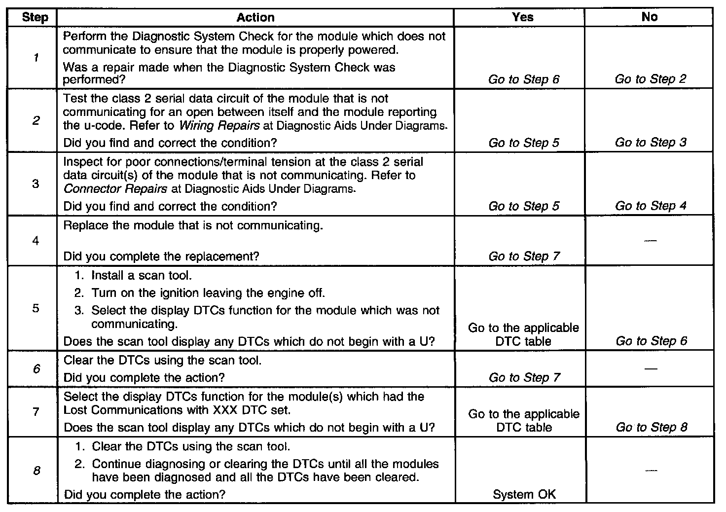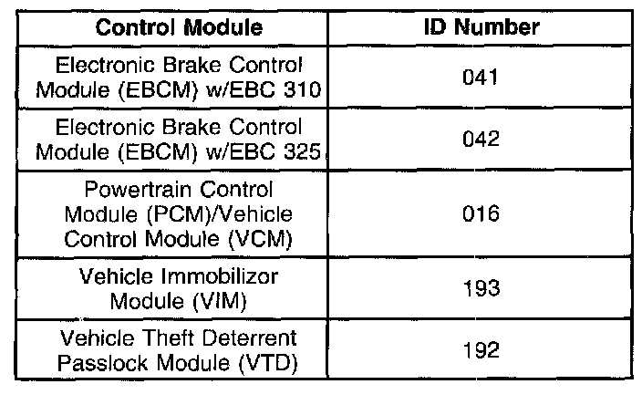 The Control Module ID Number list provides a method for determining which module is not communicating. A module with an internal class 2 serial data circuit malfunction or which loses power during the current ignition cycle would have a Lost Communication DTC set by other modules. Use the Control Module ID Number list in order to determine which module is not communicating and the Lost Communications with 1XXX diagnostic table in order to diagnose the malfunction.
