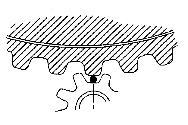 5. Measure the clearance between the top of the ring gear tooth and the bottom of the pinion tooth using the width of a wire gage or standard feeler stock. Normal clearance is 0.5 to 1.5 mm (0.02 to 0.06 in).