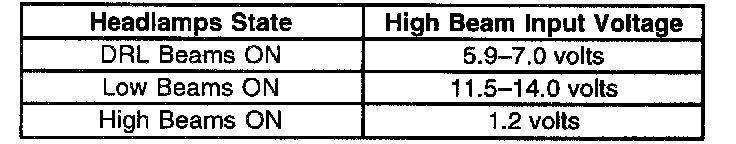 The BCM uses this input in order to determine the state of the high beam headlamps. The BCM measures the circuit voltage at a point between both of the high beam headlamps and the beam selector switch. The high beam input voltage will vary depending on the state of the headlamps. Refer to the table.