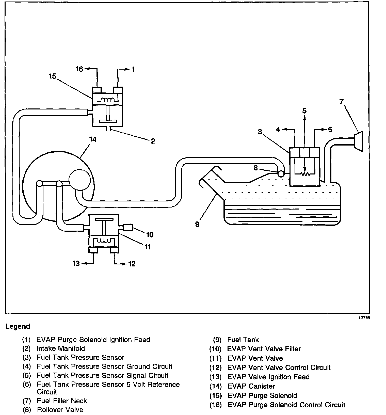 The EVAP system uses a fuel tank pressure sensor located on top of the fuel tank sender unit, in order to detect when the EVAP system is purging. The fuel tank pressure sensor detects the flow from the engine through the EVAP canister purge solenoid valve. When the EVAP system is not purging, the fuel tank pressure sensor will detect no change in fuel tank vacuum. When the EVAP system is purging, the fuel tank pressure sensor will detect a vacuum in the fuel tank. A change in fuel tank pressure will be displayed on the scan tool.