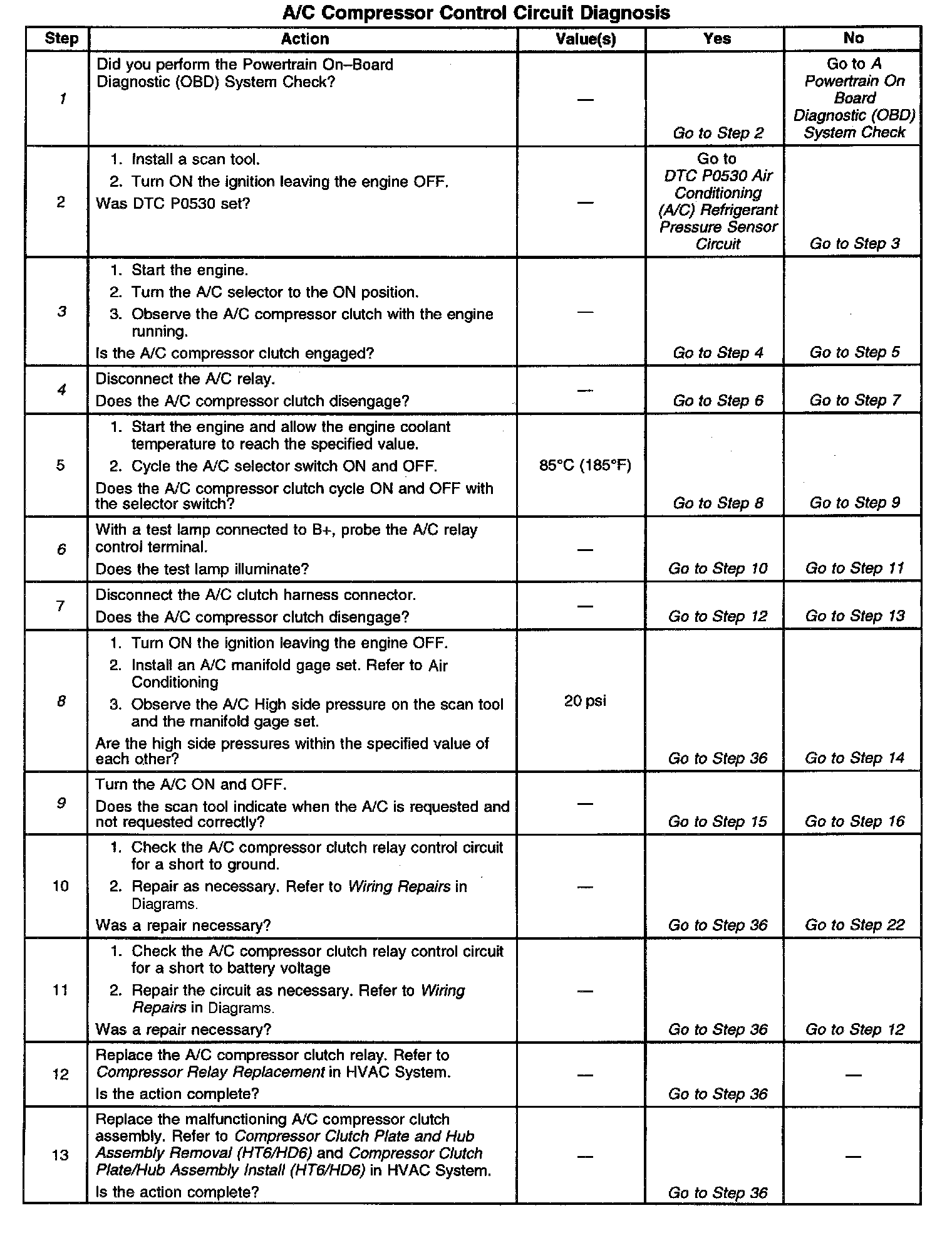 ^ An A/C refrigerant pressure outside the range of 43 to 428 psi, will cause the A/C compressor clutch to be disabled by the PCM. Observe the A/C refrigerant pressure parameter on the scan tool for 2 minutes with the engine idling and A/C ON. If pressure goes out of range, refer A/C Diagnosis.