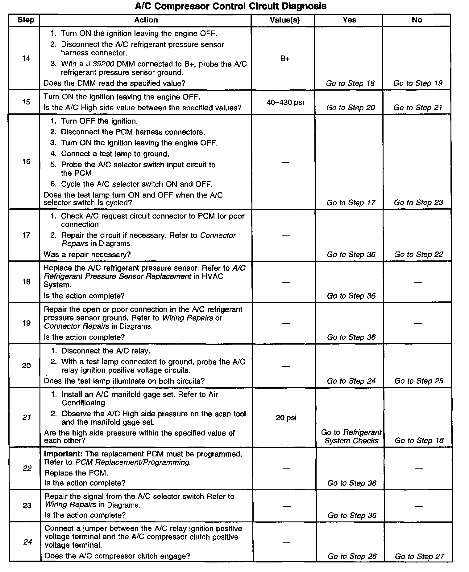 21. This step determines if the A/C refrigerant pressure sensor is out of range causing the A/C compressor clutch to be disabled or if the A/C charge is to low to allow A/C operation.