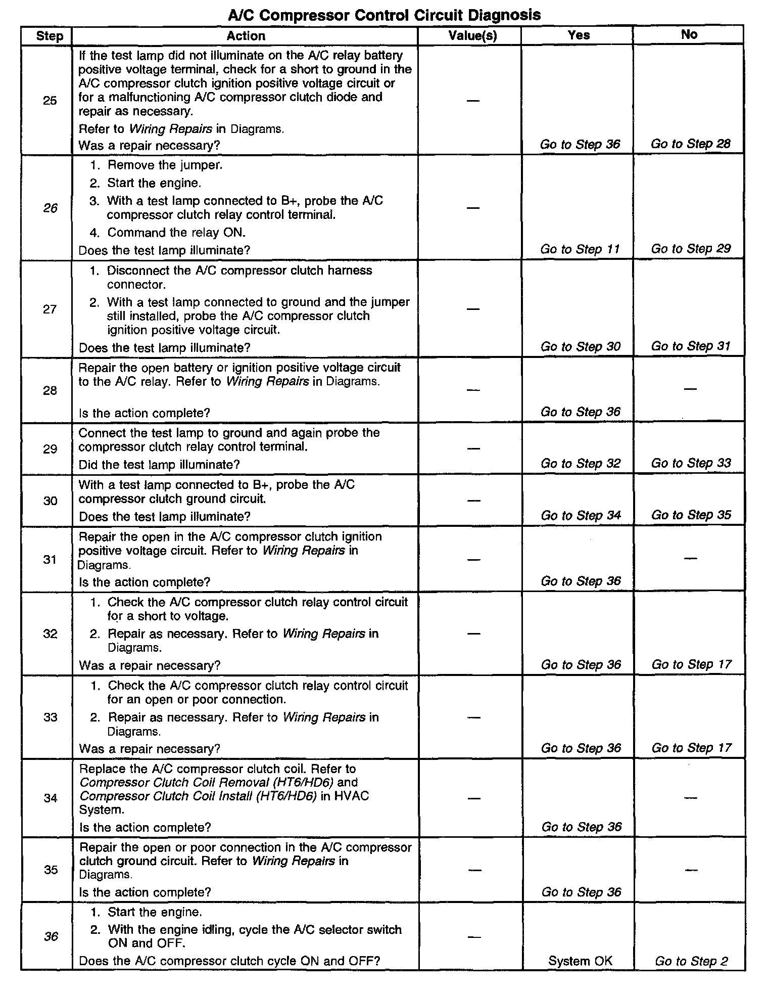6. A test lamp that does not illuminate indicates that the A/C compressor clutch relay is malfunctioning.