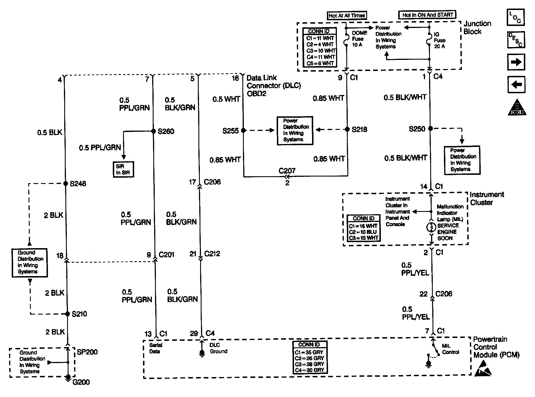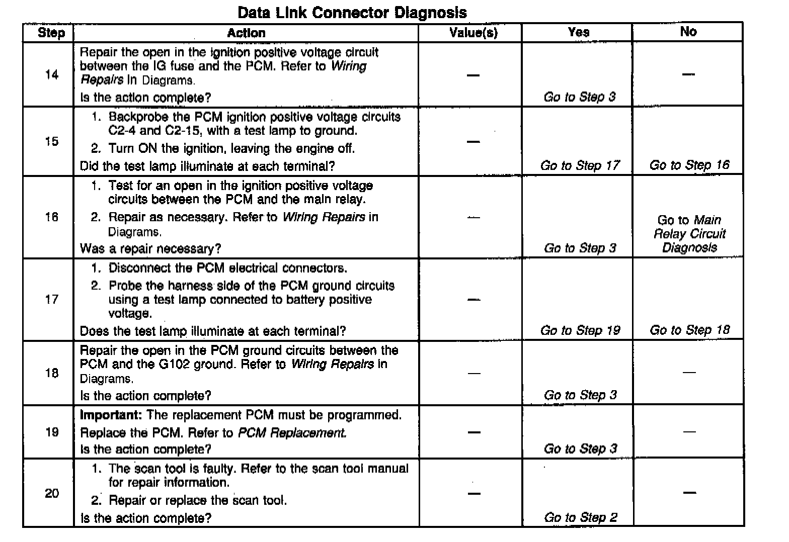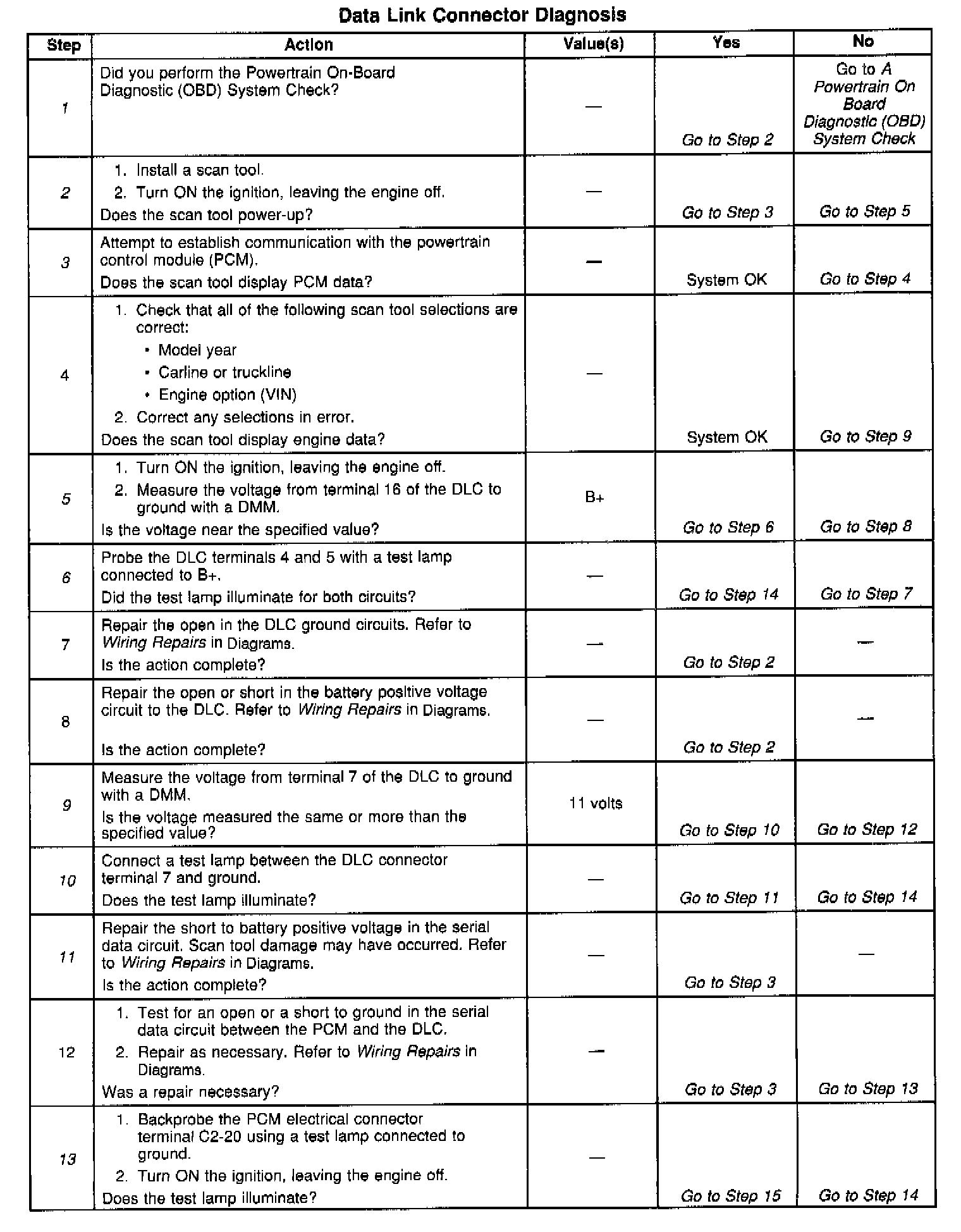 13. This step checks for voltage in the ignition positive voltage circuit that supplies the PCM. An open in this circuit will disable the PCM and the main relay. The PCM will not provide serial data if the circuit is open.