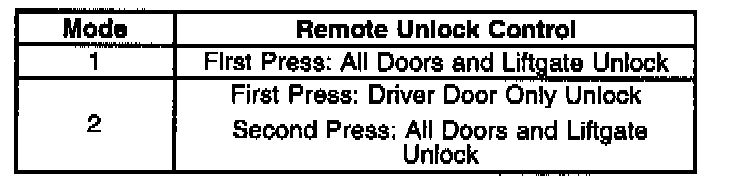 The seat belt telltale will flash and the chime will sound 1-2 time in order to indicate which remote unlock control mode the BCM is in. Each time the transmitter UNLOCK button is pressed, the mode number will advance. A transition past mode 2 will repeat and start again at mode 1.