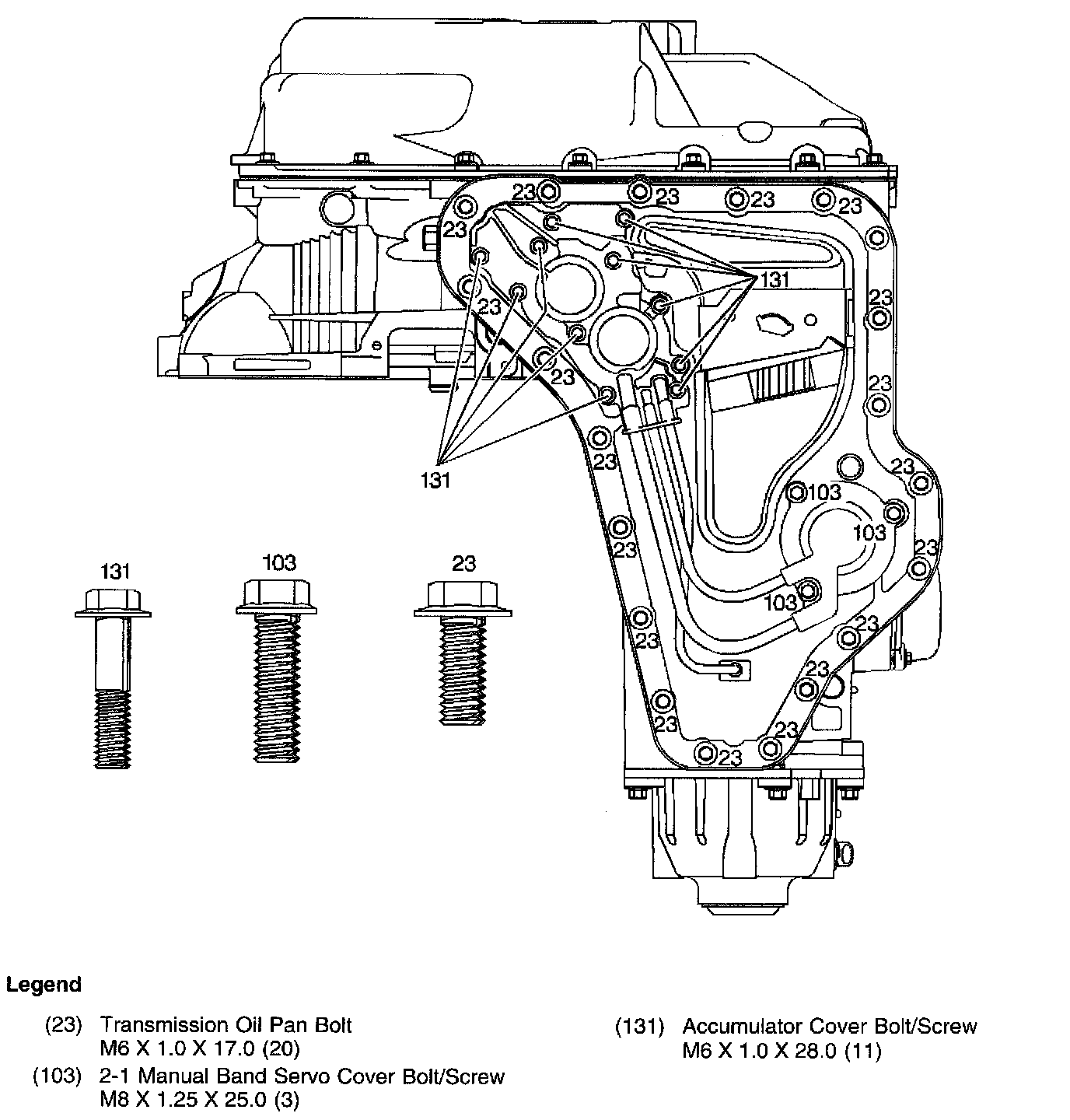 Bottom Pan, Accumulator Cover and Manual 2-1 Band Servo Cover Bolt Locations