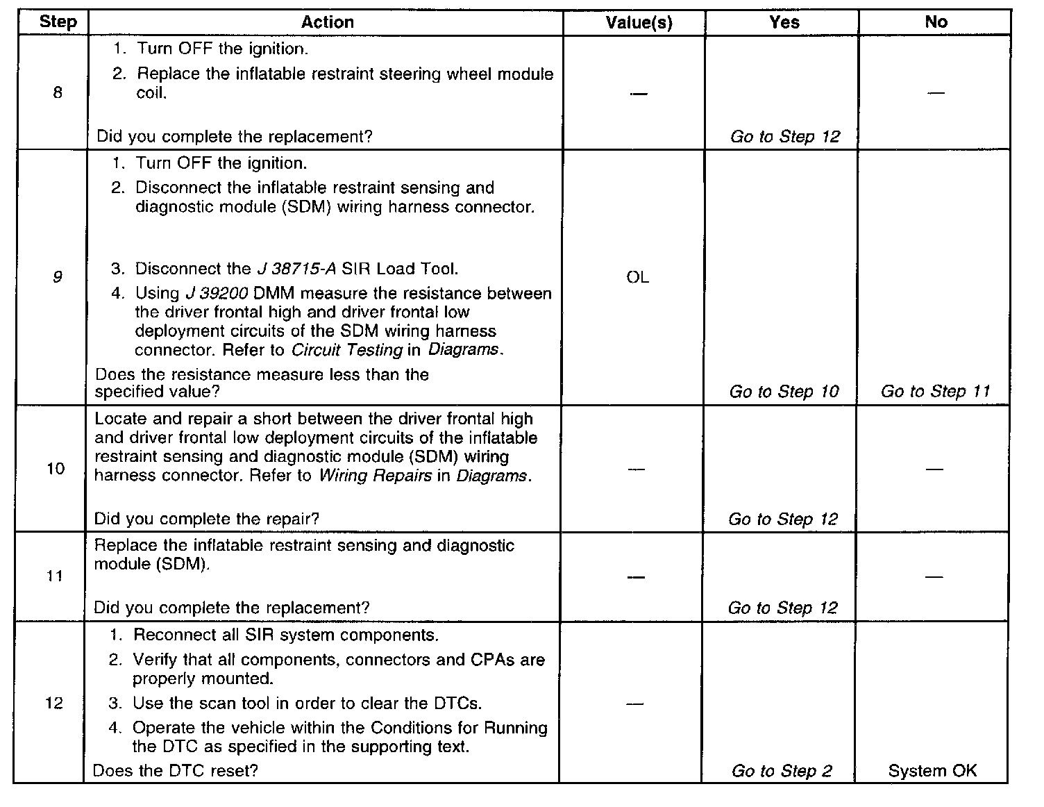 9. Tests for a short between driver frontal high and driver frontal low circuits or if there is a malfunctioning SDM.