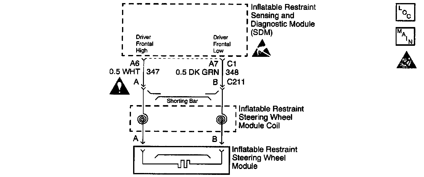 ^ A malfunctioning shorting bar in the inflatable restraint steering wheel module 2-way connector.