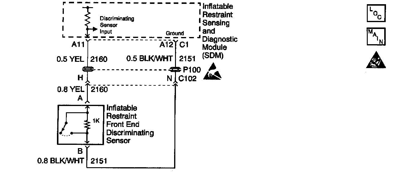 The inflatable restraint Sensing and Diagnostic Module (SDM) monitors the front end discriminating sensor circuit for front impact detection. The SDM processes the signal provided by the front end discriminating sensor to further support deployment of the air bags. The front end discriminating sensor is an input only to the SDM and does not directly cause air bag deployment. When you first turn the ignition switch to the RUN position, the inflatable restraint sensing and diagnostic module (SDM) performs tests to diagnose critical malfunctions within itself. The SDM then performs the following continuous diagnostic tests on the deployment loops: