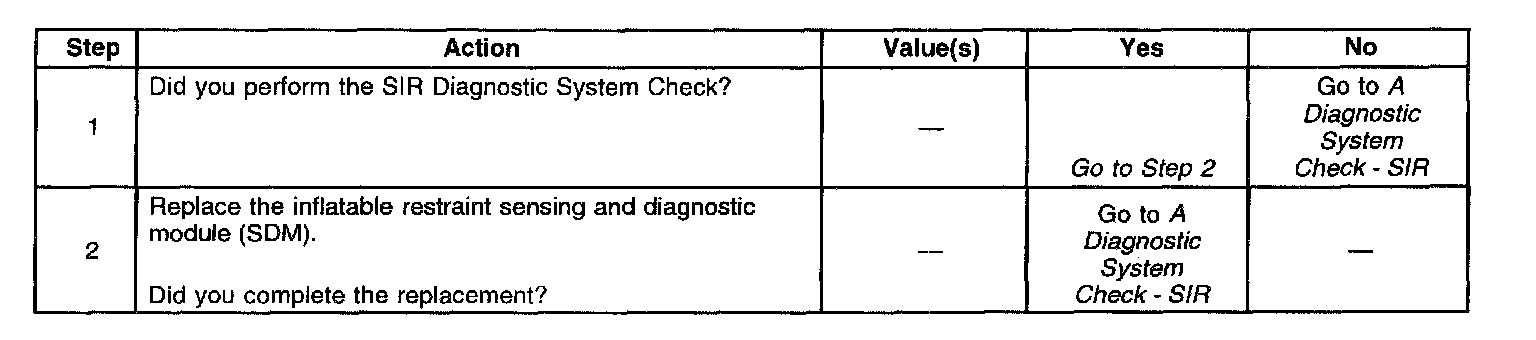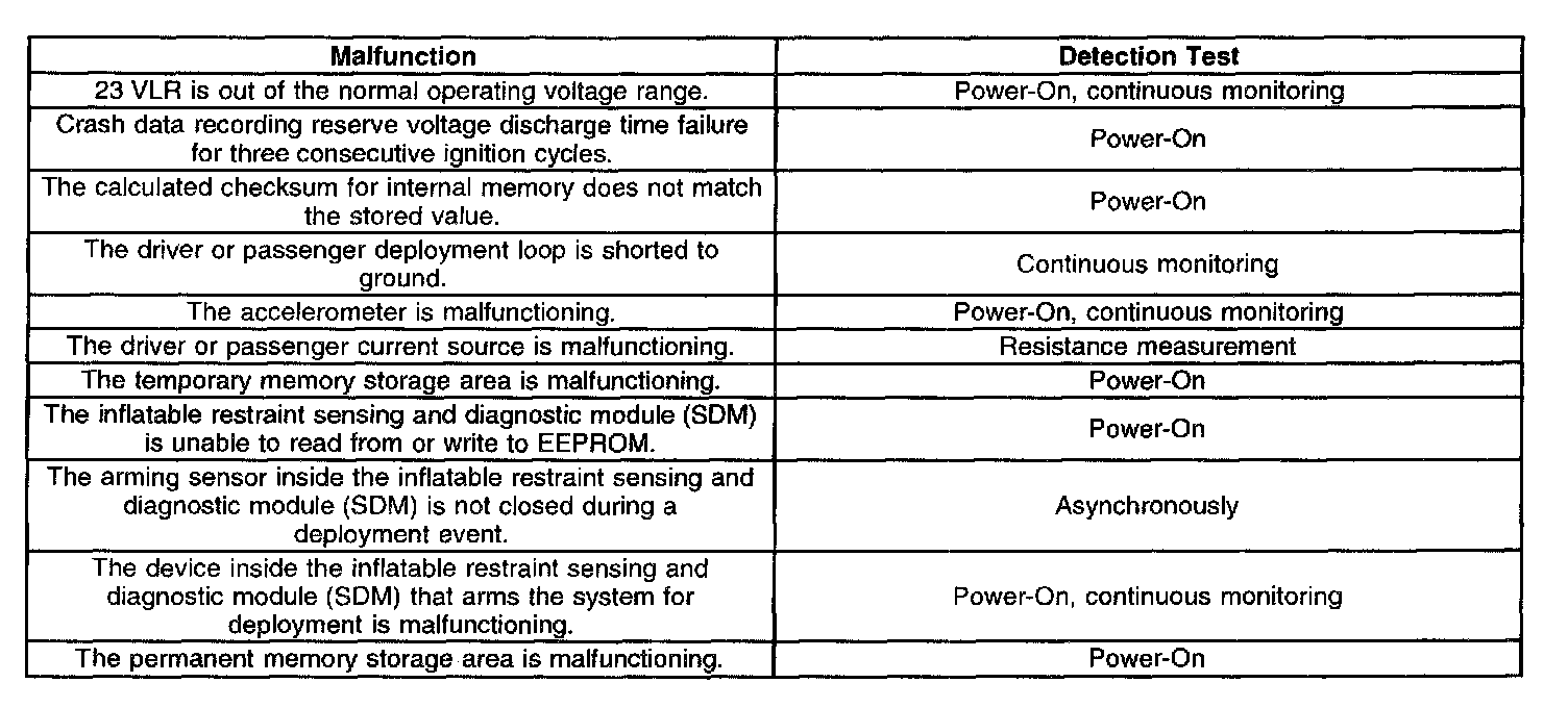 DTC B1000 is an indication of a potential internal inflatable restraint Sensing and Diagnostic Module (SDM) malfunction. DTC B1000 will set upon detection of any condition in the table below.