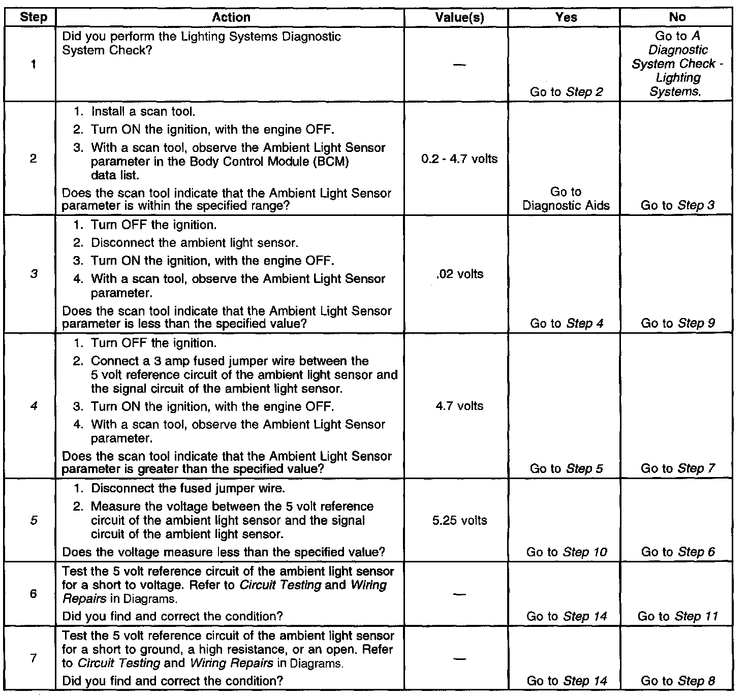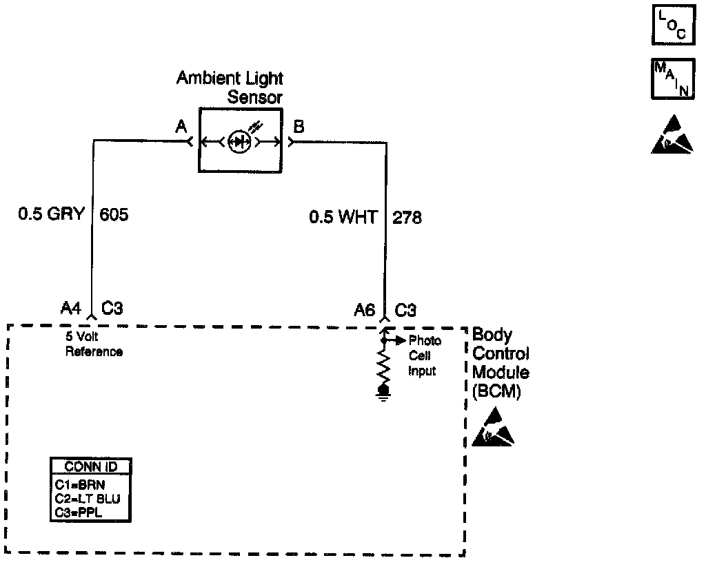 The body control module (BCM) monitors CKT 278 in order to determine if the daytime running lights (DRL) or the auto headlights (AHL) should be turned ON in the AUTO mode. When the BCM senses the ambient light sensor voltage between 1.7- 4.7 volts (light state) the DRL will be commanded ON. When the BCM senses the ambient light sensor voltage between 0.2 - 1.0 volts (dark state) the AHL will be commanded ON.