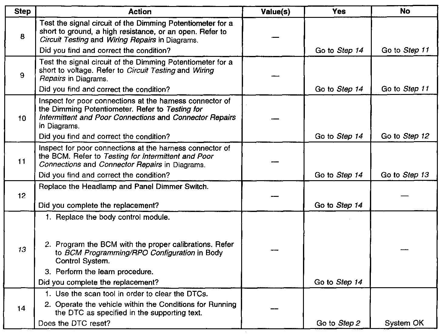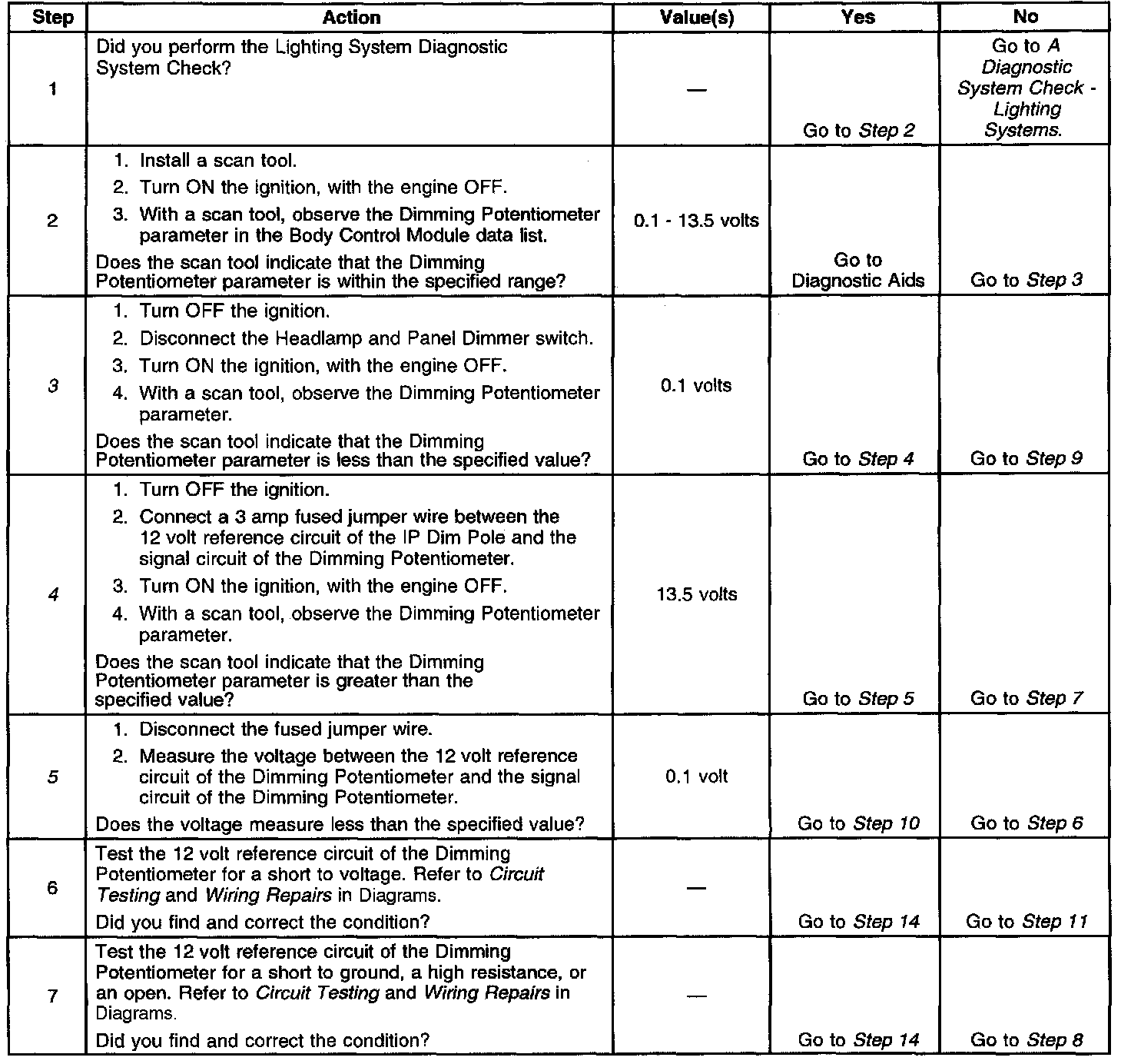 The number(s) below refer to the step number(s) on the diagnostic table.