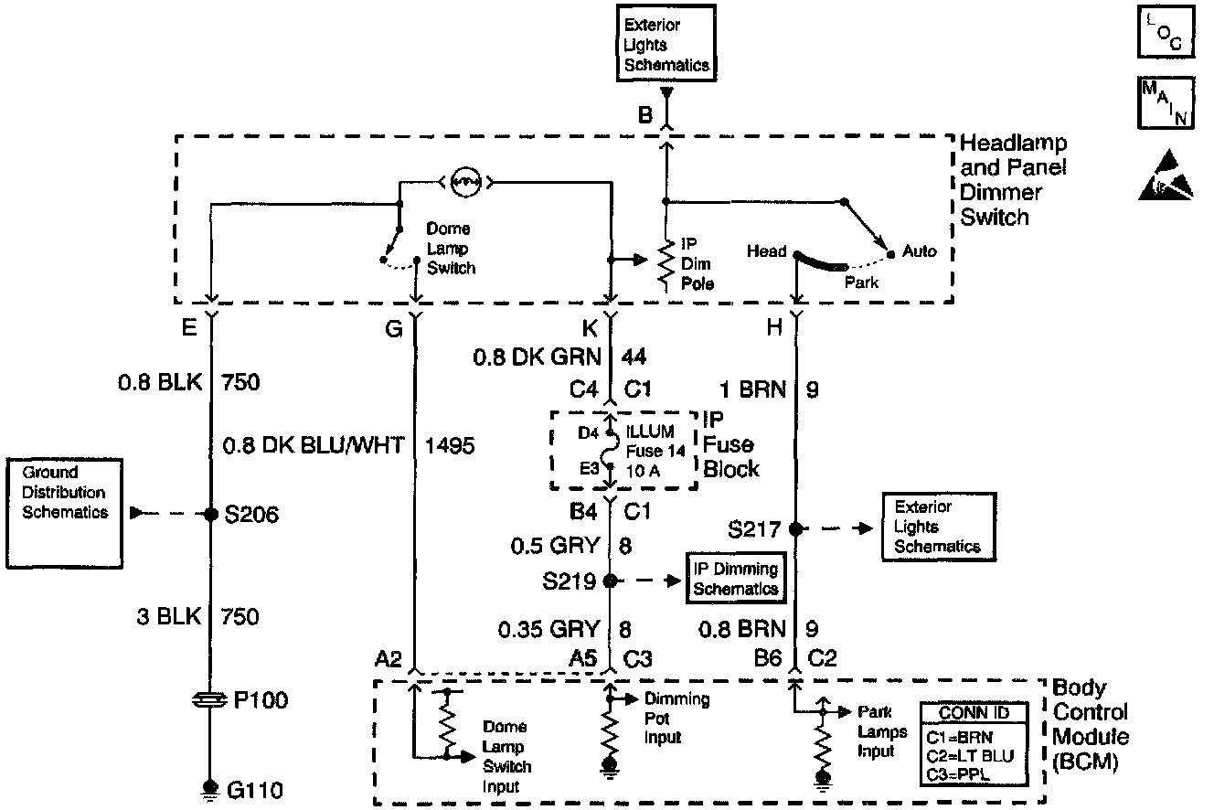 The body control module (BCM) monitors the instrument panel (IP) dimming voltage on CKT 8 from the dimmer switch (thumb wheel), part of the headlamp and panel dimmer switch. The dimmer switch controls the IP dimming by sending a signal to the BCM on CKT 8 in order to indicate the position of the thumb wheel when the headlamps are ON. The dimmer switch also provides dimming for the backlighting of the instrument cluster, the radio and the overhead console.