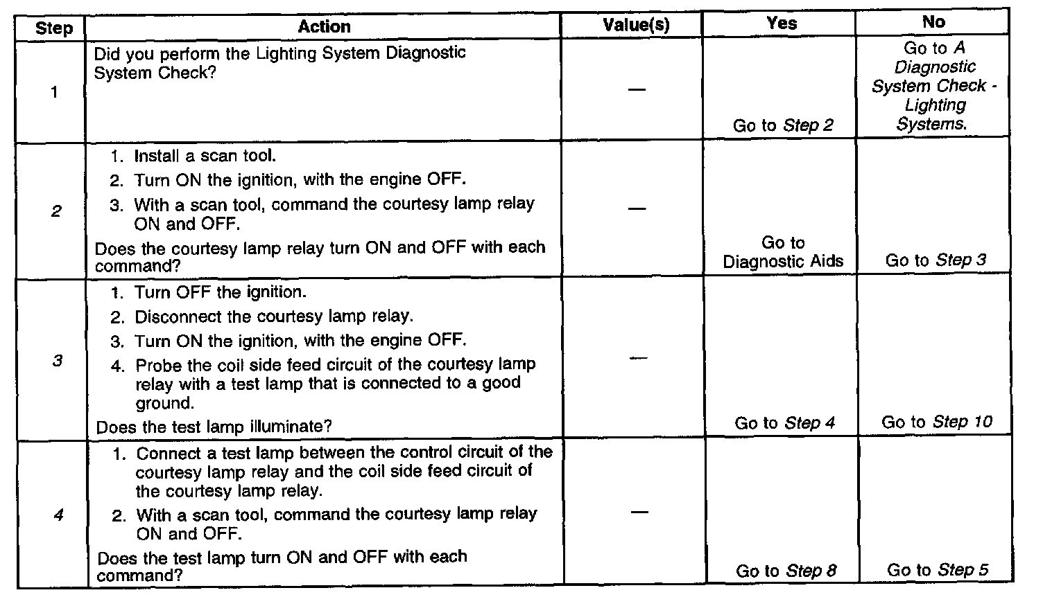2. Listen for an audible click when the courtesy lamp relay operates. Command both the ON and OFF states. Repeat the commands as necessary.