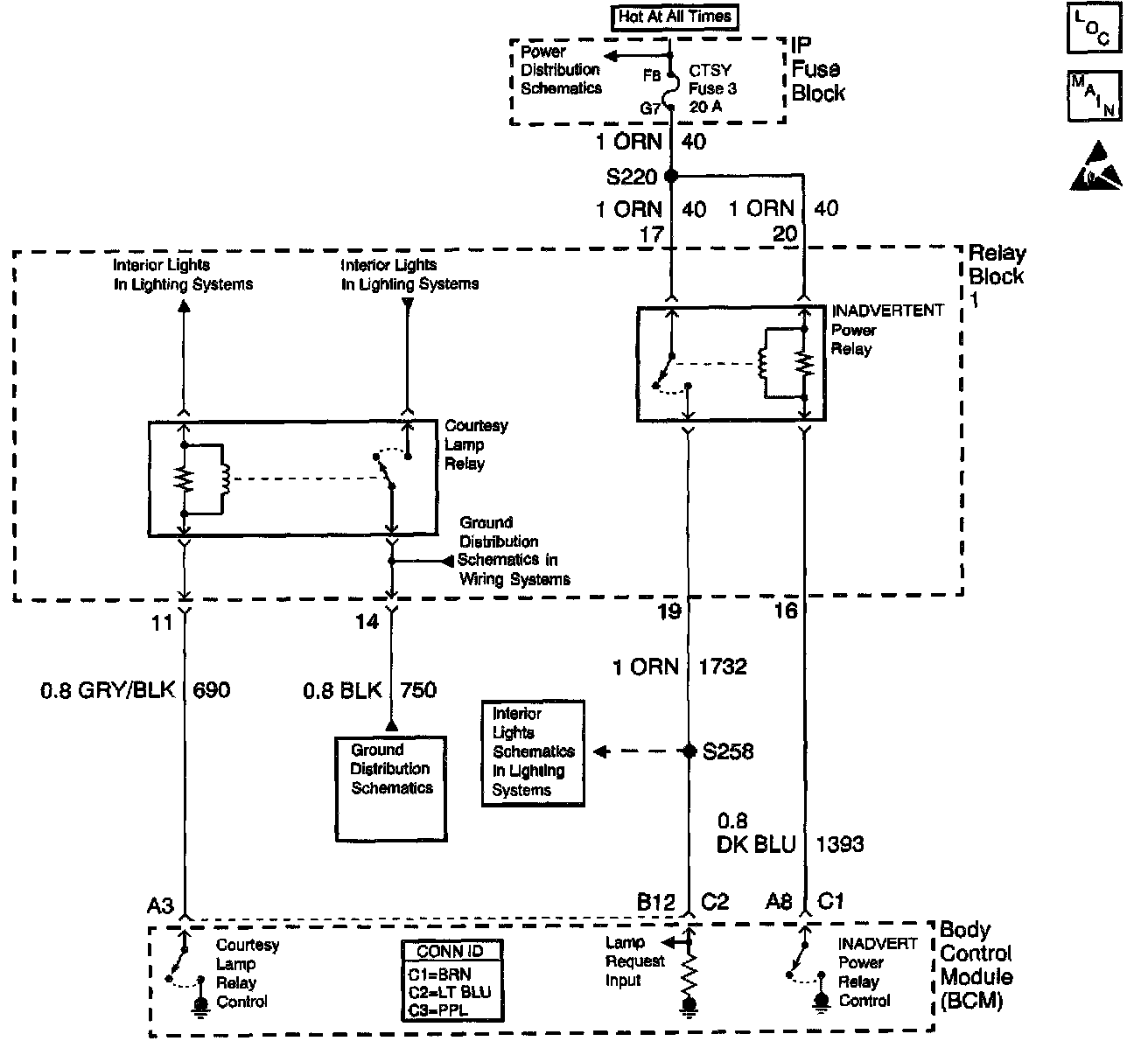 The body control module (BCM) controls the ground of the courtesy lamp relay on CKT 690. When the BCM receives a signal from a door jamb switch, a signal to unlock the doors from the remote control door lock module receiver module or the dome lamp switch being turned ON, the BCM grounds the relay and turns ON the courtesy lamps.