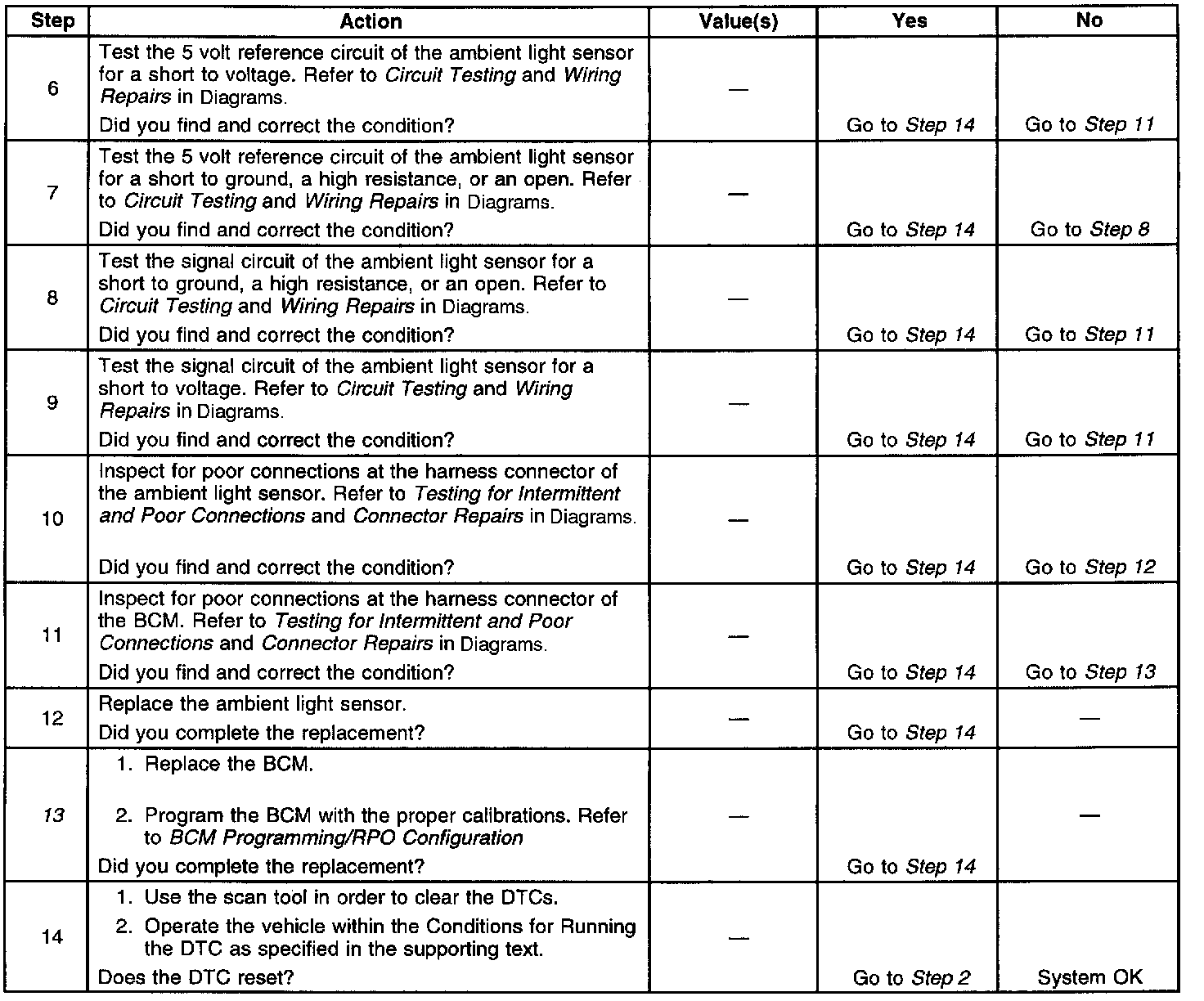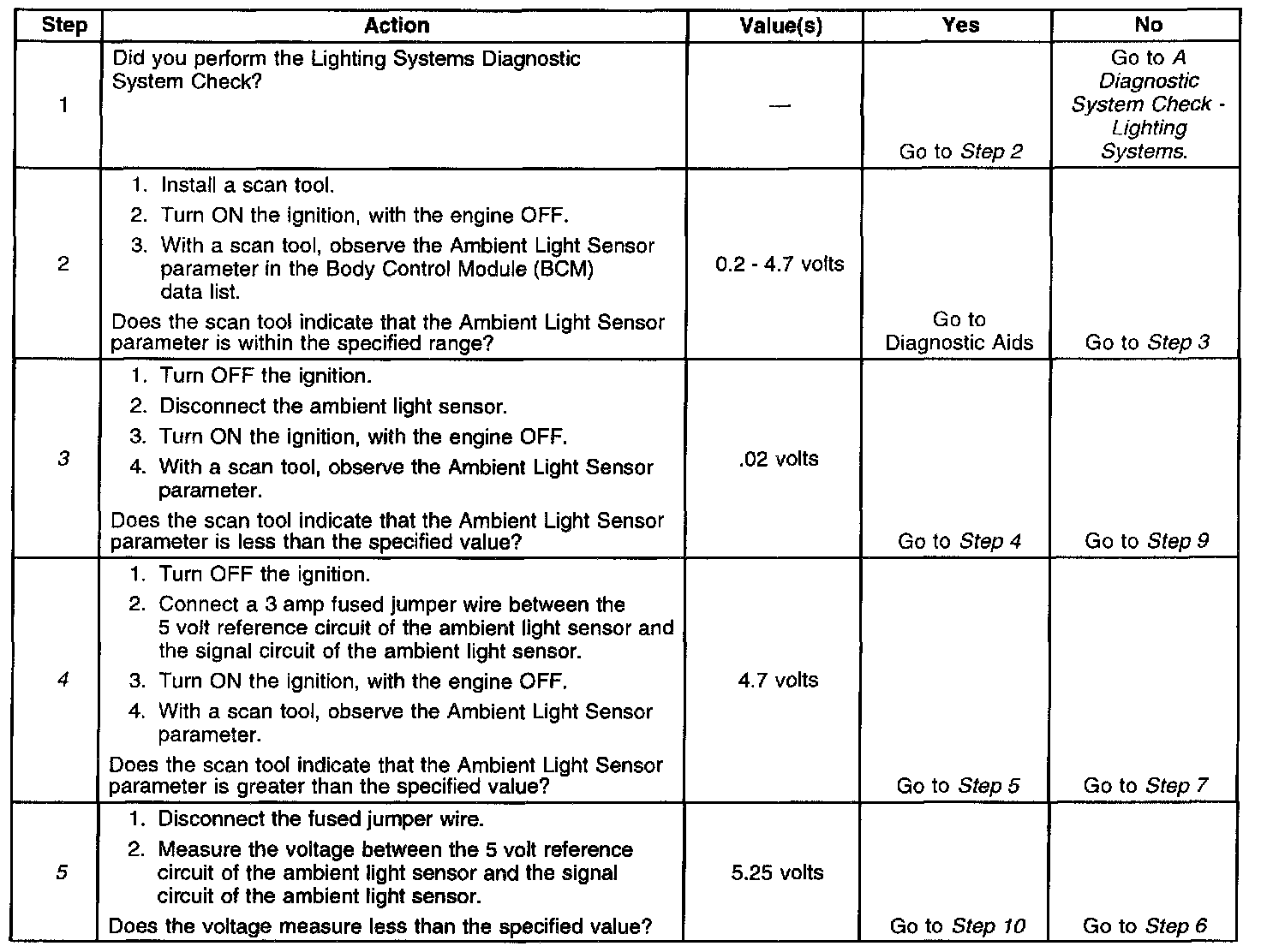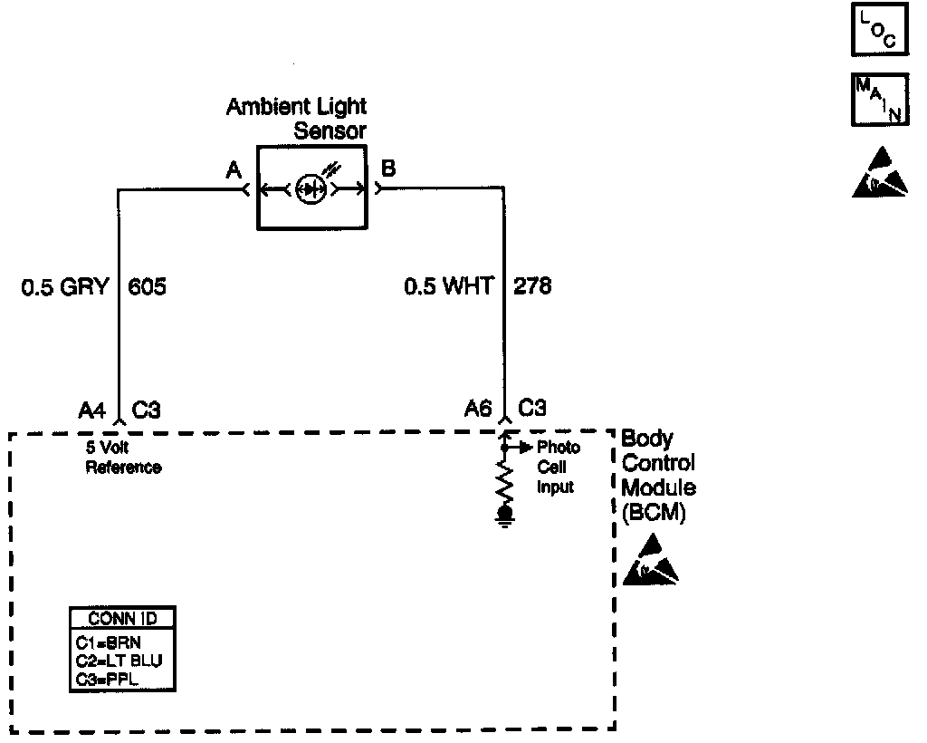 - When the ambient light sensor input voltage is less than 0.2 volts (CKT 278 is open or shorted to ground).