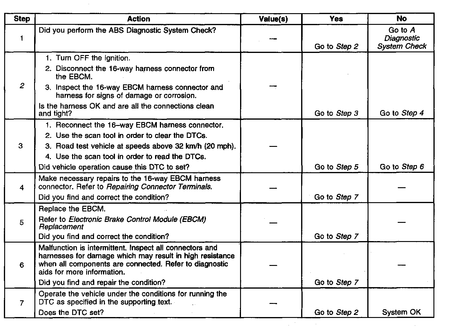 - An Ignition Latched DTC will disable ABS and DRP during the course of the current ignition cycle, (even if the cause of the DTC is intermittent). The DTC will be stored in the EBCM memory until it is repaired, and/or the DTC is cleared. After the DTC is repaired and/or cleared and the ignition is turned to ON, the ABS lamp will remain lit until the EBCM completes a power-up self test. This test concludes when the vehicle has reached a speed of greater than 13 km/h (8 mph) and the wheel speed inputs have been checked by the EBCM.