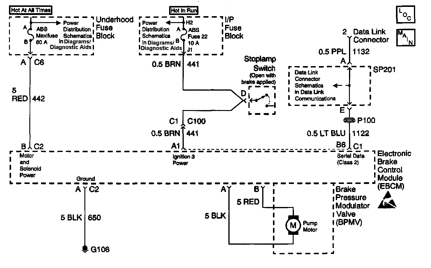 The EBCM relay closes and vehicle battery voltage is applied to the high side of all six solenoid coils (three isolation solenoid coils and three dump solenoid coils) whenever ABS valve activity may be required. Each valve solenoid is energized when the EBCM microprocessor turns on an output driver transistor to short the low side of the solenoid coil to ground. The EBCM microprocessor monitors the state of the circuit on the low side of each solenoid coil with a feedback circuit to the EBCM microprocessor. Whenever the EBCM relay is closed and a solenoid coil output driver transistor is not turned on, the feedback voltage should be high. If it is not, and the problem persists long enough, the open solenoid coil DTC will set. If the EBCM relay is not turned on, the feedback voltage should be low. If it is not, and the problem persists long enough, the shorted solenoid coil DTC will set. The relay and the six solenoid coils are located within the EBCM.