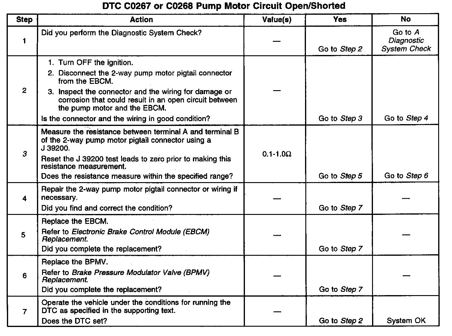 The pump motor is integral with the BPMV. Do not service the pump motor separately. A poor power-to-ground connection at the 2-way EBCM connector or the 2-way motor harness from the EBCM to the pump motor can cause a DTC C0267 to set. A seized pump motor, shorted pump motor windings or a poor power/ground at the 2-way EBCM connector can cause a DTC CQ268 to set. Replace the EBCM or the BPMV if the following tests show that the pump motor EBCM internal circuits have failed.