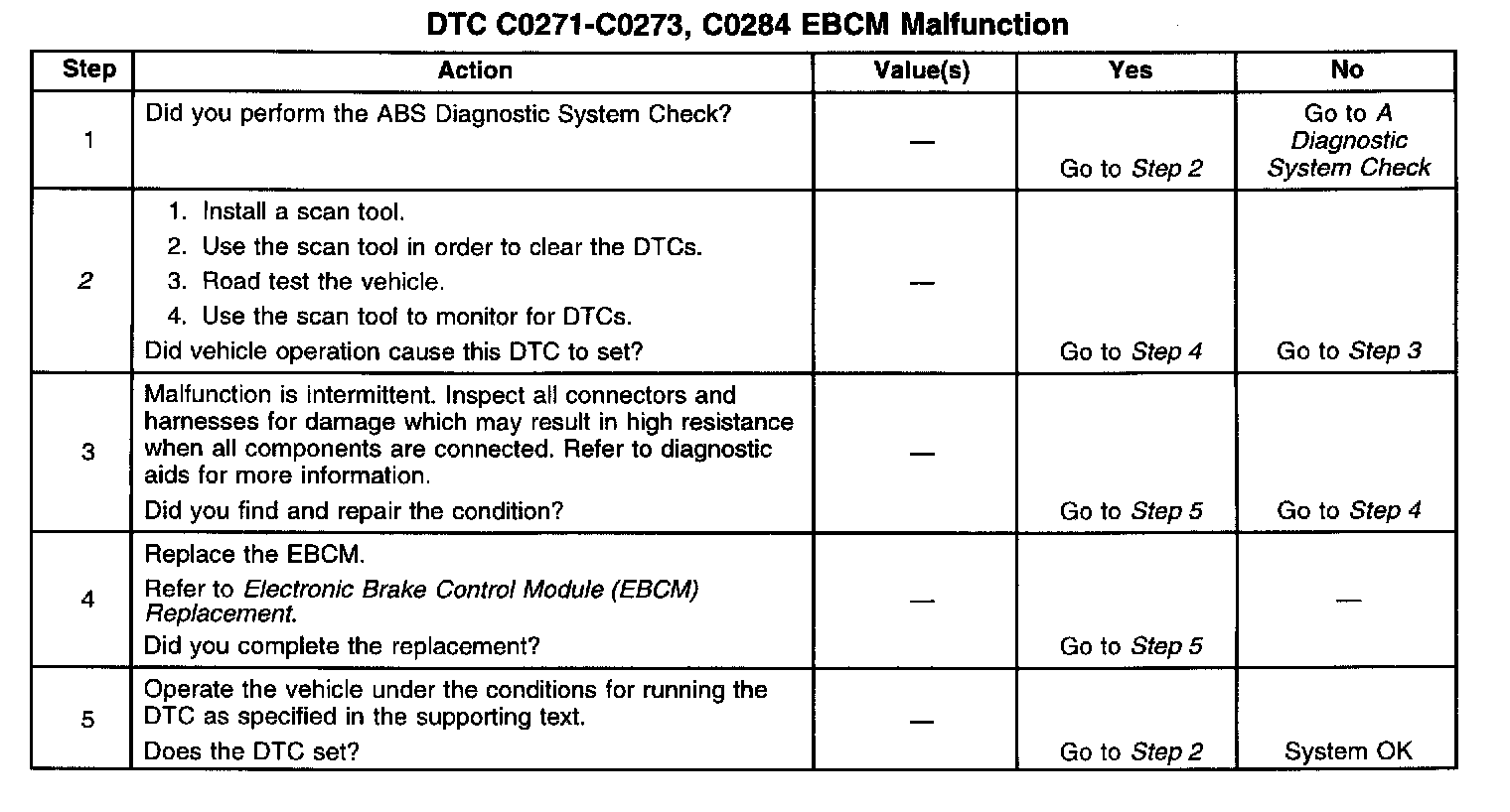 DTCs C0271 through C0273, and C0284 are EBCM internal diagnosis trouble codes. Replace the EBCM if these tests show that the EBCM circuitry has failed. Refer to Electronic Brake Control Module (EBCM) Replacement.