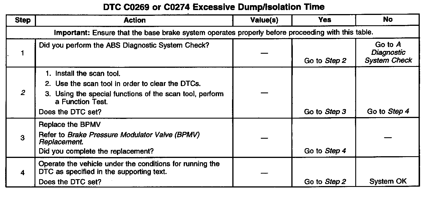 The EBCM microprocessor grounds the dump coil to energize and close the dump valve. This will release the excessive brake pressure which was applied by the driver to the wheels. If the EBCM microprocessor generates a dump command on one or more wheel for greater than nine seconds, the DTC will set (C0269).