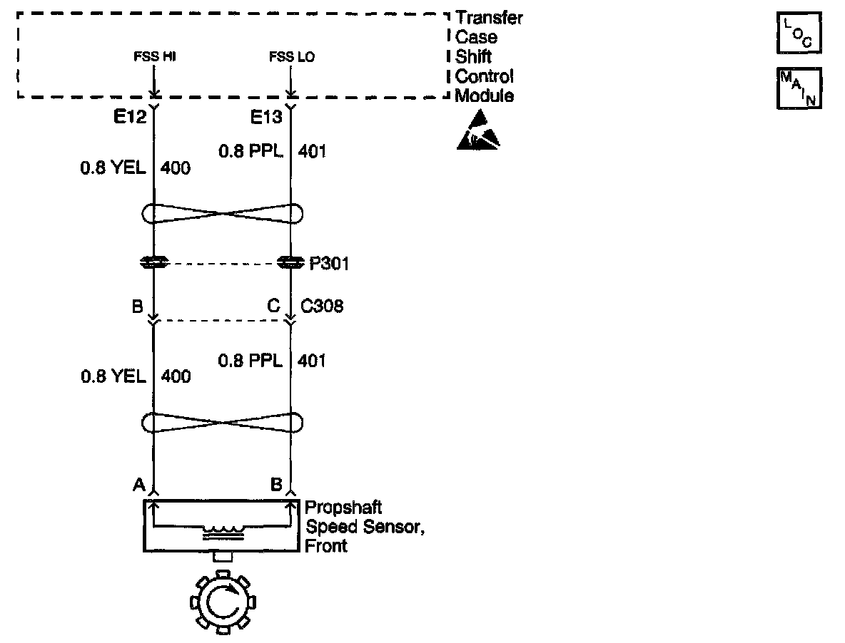 The Front Propshaft Speed Sensor is a Permanent Magnet (PM) generator. The PM generator produces a pulsing AC voltage. The AC voltage level and number of pulses increases as speed increases. The transfer case shift control module converts the pulsating AC voltage to a propshaft RPM which is used for calculations, and to monitor the difference between the front and rear propshaft speed. It is used in the AUTO 4WD mode of operation to determine the amount of slip and the percent of torque to apply to the front axle. The propshaft RPM can be displayed with a scan tool.