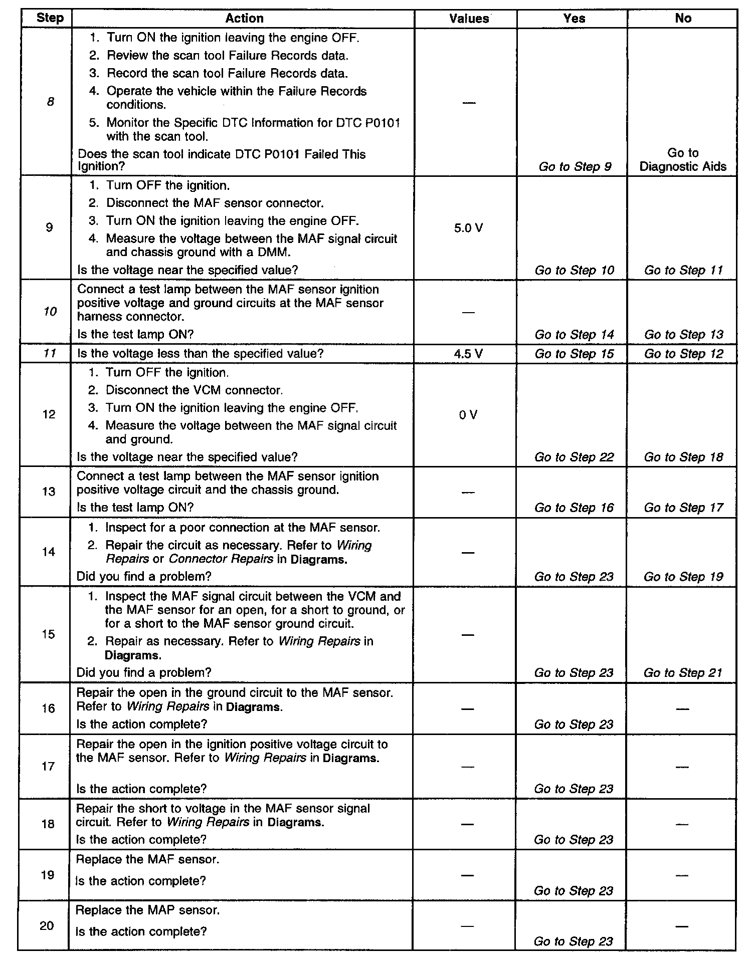 10. A voltage reading of less than 4.0 volts or over 6.0 volts at the MAF sensor signal circuit indicates a fault in the wiring or a poor connection.