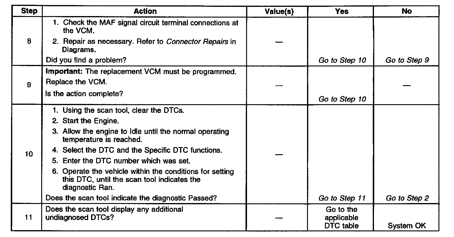 ^ Inspect for a damaged harness. If the harness appears to be OK, observe the scan tool while moving the connectors and the wiring harnesses related to the MAF sensor. A change in the display will indicate the location of the malfunction.